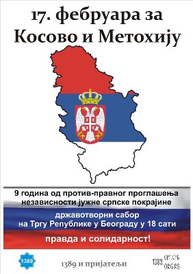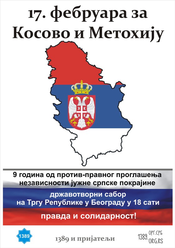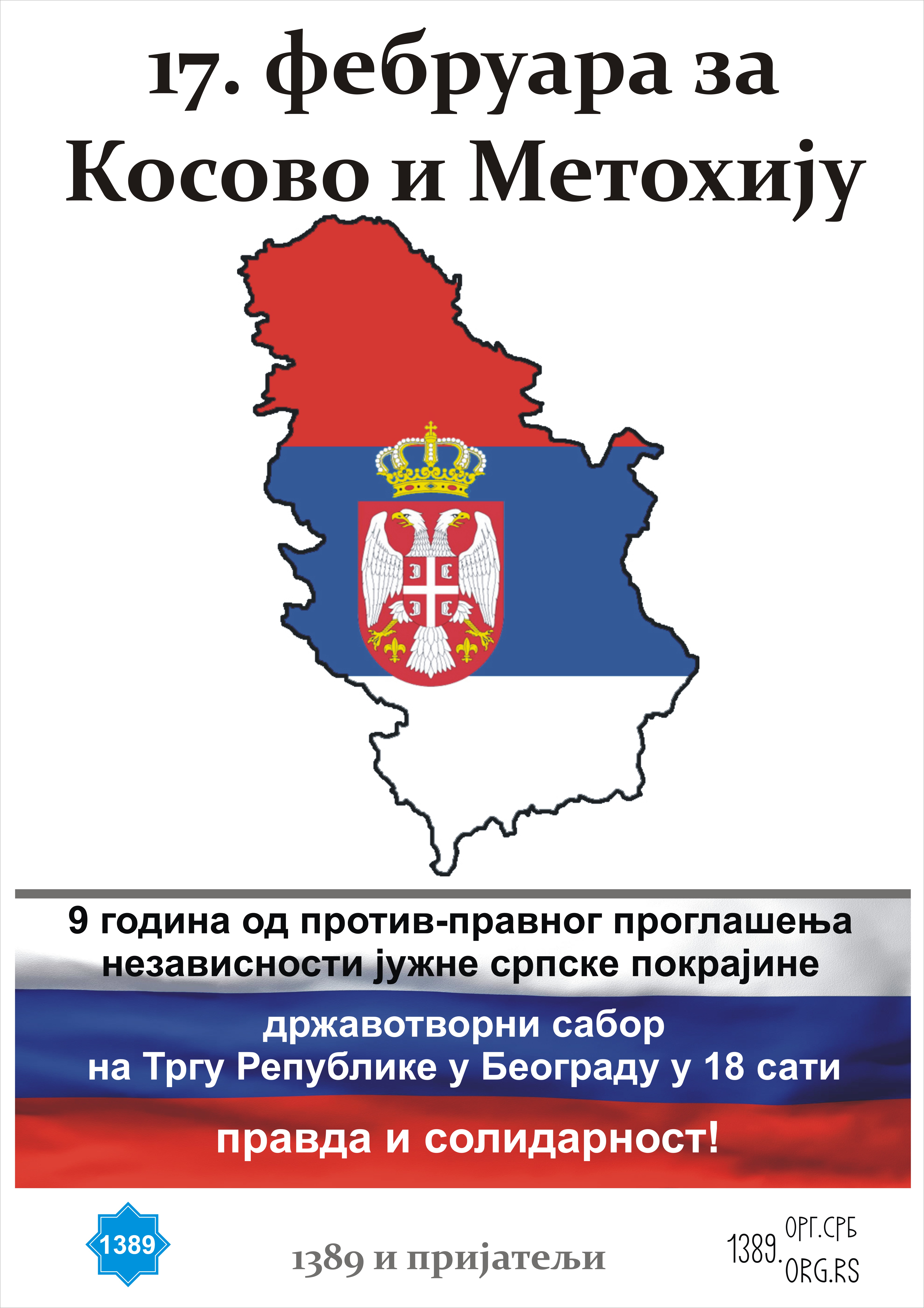 17. фебруара за Косово и Метохију22.1.2017. Родољуби Србије вас позивају на нови државотворни сабор 17. фебруара на 9-огодишњицу проглашења независности Косова и Метохије од стране шиптарских терориста у Приштини. После дуго година ћутања, прошле 2016. године је уприличена патриотска менифестација у центру престонице, а ове године, ако Бог да, настављамо добру традицију. Српска пословица каже да је ћутање знак одобравања, зато не смемо и немојмо ћутати пред: великом неправдом, кршењем нашег Устава и међународног права, тријумфом тероризма, уништавањем Православних храмова и манастира и патњама нашег невиног народа, цивила на светој земљи. Србија по питању одбране своје јужне покрајине има подршку већине земаља света и руски вето у Савету безбедности УН, тако да Косово није независна држава. Велике политичке промене у Европи и Америци нам иду на руку и може се наредних година очекивати повољнији развој догађаја. Хвала нашој руској браћи на челу са Владимиром Путином за принципијелну подршку и велику помоћ у одбрани суверенитета и територијалног интегритета Србије. Придружите се! |