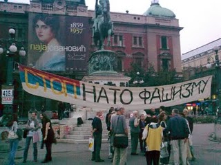 415. дан протеста - приказ шпанског блогаhttp://retesc.blogspot.com/2009/10/stop-nato-fasizmu.html RetazosEscrituras expuestas en el siglo XXI “Stop al fascismo de la OTAN”"Stop NATO fasizmu"Alvaro Ballesteros nos manda esta foto tomada en el centro de Belgrado en septiembre de 2009, en la que se muestra a un reducido grupo de personas manifestandose contra la OTAN ante la centrica estatua de Knez Mihajlova. Serbia rememora en 2009 el decimo aniversario del bombardeo que segun Human Rights Watch costo la vida a mas de 500 civiles. La repulsa a la OTAN en 2009 tiene lugar en un ambiente politico confuso, ya que desde 2007 Serbia ha entrado en un proceso de aproximacion a la Alianza Atlantica. La pancarta, que coincide con el cartelon de una exposicion de Paja Jovanovic, celebre pintor patriotico, dice: “Stop al fascismo de la OTAN”.