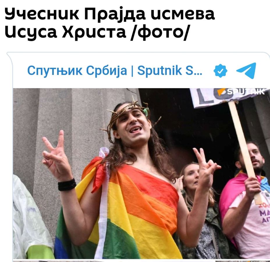 Америка и Немачка силују Србију - евро "прајд" 18.9.2022. Америка и Немачка су извршили тежак злочин силовања Србије у суботу 17.9.2022. године преко својих слугу на челу са премијерком Аном Брнабић путем спровођења забрањене евро геј параде - европрајда. Иако је Министарство унутрашњих послова Србије забранило одржавање европрајда, а Управни суд одбио жалбу организатора, упркос јасном противљењу огромне већине грађана Србије, против јасног става патријарха Порфирија и Српске православне цркве и других великих традиционалних религијских заједница у Србији, упркос Уставу Србије који јасно дефинише једино заједницу мушкарца и жене као брак, упркос три велике народне литије 14.08., 28.08. и 11.09. 2022. године на којима су десетине хиљада људи на врло миран и достојанствен начин изнели потпуно противљење одржавању евро прајда - он је ипак одржан на суров, агресиван и дивљачки начин.