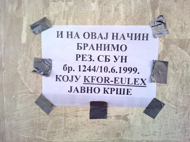 Кукавичлук и лажи КФОР-а28.10.2011. Четири српске општине на северу Косова и Метохије су пропустиле, у занк добре воље, неколико возила КФОР-а кроз барикаде. Међутим, снаге КФОР-а су злоупотребиле овај поступак и направиле материјалну штету Србима на барикадама. Затим су представници НАТО-а на северу Космета давали изјаве како су они извршили пробој барикада, што је лаж и превара. Због оваквих потеза КФОР-а, као и неовлашћеног уласка ЕУлекса на север, постоји могућност да се барикаде поново потпуно затворе. Са друге стране, морал војника КФОР-а је у веома лошем стању због тромесечне успешне блокаде северног Косова, као и због чињенице да војници не воле да се сукобљавају са цивилима, међу којима има и доста жена, који бране своје домове, улице, села и градове. Слике са барикаде на мосту у Косовској Митровици која није уклоњена, и видео снимак са барикаде Јагњеница ноћу (од 28.10.2011):