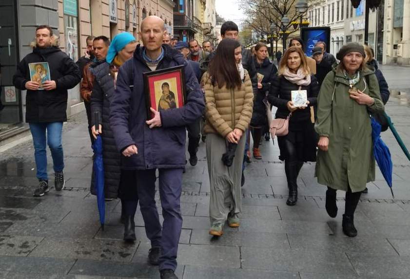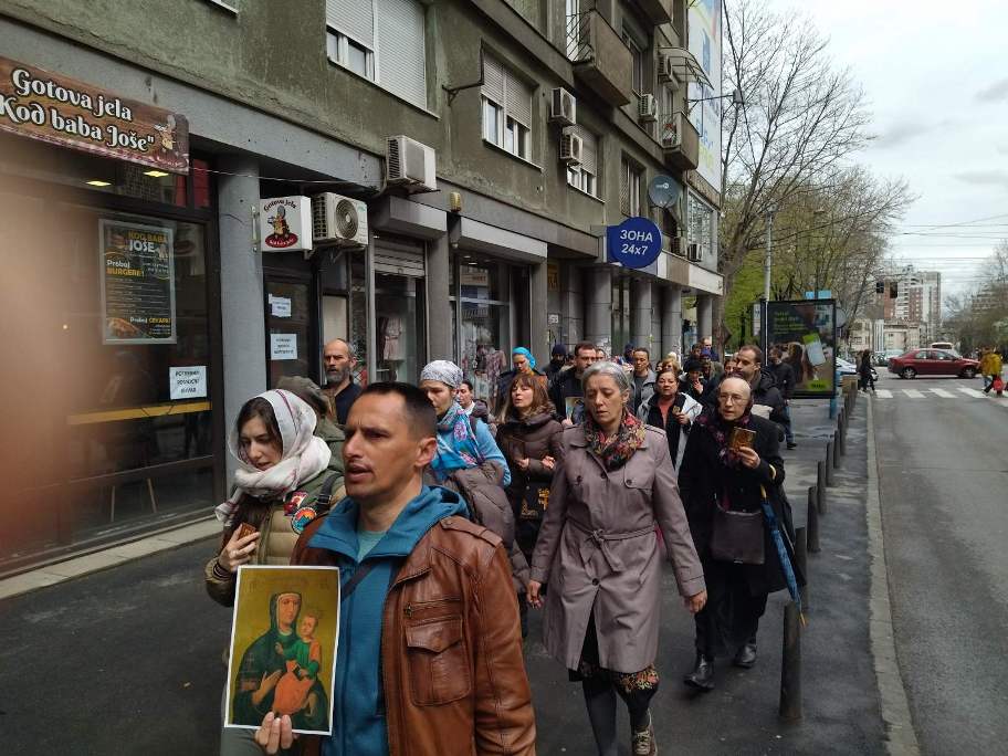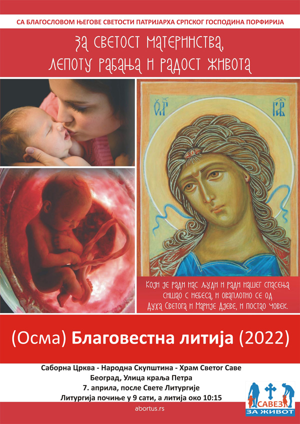 8. Благовестна литија за живот, породицу и рађање на старој релацији: Саборна црква – Народна скупштина – Храм Светог Саве, на велики Православни празник Благовести 7. априла након Литургије, са благословом патријарха Порфирија. 2020. године у Србији је било 55,000 више умрлих него рођених, а 2021. смо достигли рекордни минус од чак 70,000! Један од главних разлога је велики број абортуса, један од највиших по глави становника у свету, према још увек важећем Титовом закону из 1952. године, којим су деца у утроби мајке лишена права на живот. Више од половине деце која се Божијом милошћу и силом зачну у Србији бивају убијена абортусима. То је страшан грех који нас води у нестанак са лица земље. Васкршњи пост је право време за покајање, пост, молитву и литију. Крајње је време да престанемо са колективним самоуништењем. Литургија почиње у 9 сати, а литија око 10:15. С нами Бог. На слици патријарх Порфирије после Литургије у недељу 27. марта у Храму Светог вазнесења Господњег у Жаркову одакле је и потекла, покренута Благовестна литија. Благовестну литију су благословили патријарси Иринеј и Порфирије.