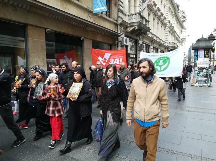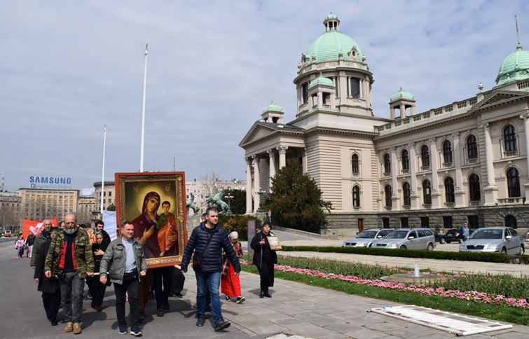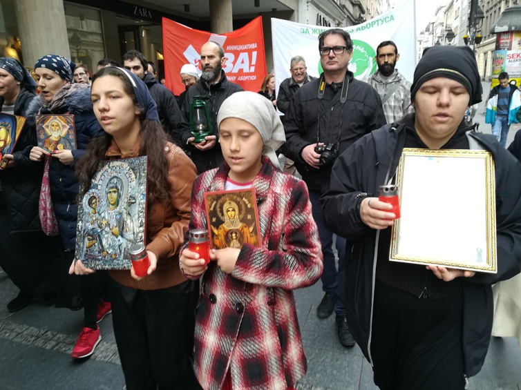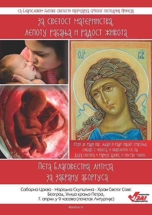 (Пета) Благовестна литија за забрану абортуса (2018) За светост материнства, лепоту рађања и радост животаДеца немају цену!Четири Благовестне литије за децу, живот, породицу и забрану абортуса су постепено утицале на промену јавног мњења у овој области. Државна политика се мења и деловање против оштрог губитка становништва постаје један од приоритета администрације. Упркос великим променама последње четири године, демографски резултати остају катастрофални. Годишњи природни прираштај Србије је минус 40 хиљада. Прошла 2017. година је статистички најгора по питању броја рођене деце у Србији од кад се врше оваква мерења; роћено је само 65 хиљада деце, а 50-их година ХХ века се рађало преко 160 хиљада деце годишње! Држава је постала веома свесна великог проблема са којим смо се суочили као друштво, али се и даље избегава најхрабрија и најефикаснија мера примерена ситуацији - забрана абортуса. Мере које држава предлаже и спроводи су углавном добре, али скупе, споре и ниске ефикасности. Забрана абортуса је најјефтинија и најефикаснија метода поправљања демографске слике нације. Деца су већ ту, од 300 до 500 хиљада сваке године, толико деце се зачне у Србији, само треба да их пустимо да се роде, да их не убијамо, да не абортирамо децу. Позивамо вас на Благовестну литију у суботу 7. априла, на велики празник Благовести, дан уочи Васкрса ове године; у 9 ујутру почиње литургија у Саборној цркви (Улица краља Петра), а Литија око 10:15. Литија се упућује ка Народној скупштини ради заједничке молитве за забрану абортуса, а затим продужава ка Храму Светог Саве где је крај ове манифестације.