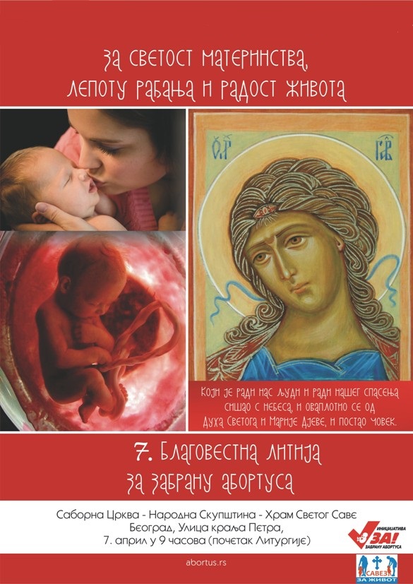 Позивамо вас да велики Православни и народни празник Благовести седми пут прославимо и обележимо литијски након божанствене литургије у Саборној цркви. Вера и добра дела су данас веома потребни Београду и Србији. Не смемо заборавити нити занемарити да је Београд посвећен као престоница Пресветој Богородици пре више од 6 векова. Потребни су наши труд и молитве како бисмо вратили престоницу и отаџбину Богу и хришћанском начину живљења. На празник Благовести који слави зачеће Христово, покренимо се за сву нашу децу, за коју знамо да су жива и да им срце куца - не (тек) од рођења - већ од тренутка зачећа, за материнство и очинство, за маме и тате, за хришћански брак и девственост до брака, за светињу живота, за радост и лепоту доласка на свет нове деце, нових малих људи, за забрану абортуса. Покренимо се на Благовести 7. априла, придружимо се седмој Благовестној литији за заштиту нерођене деце, коју закони Србије не виде и не препознају, не штите и занемарују што доноси страшне моралне и демографске последице – духовно и биолошко изумирање нације. Нека је Бог у помоћ свим људима добре воље и нека Његова милост и љубав сачувају свако живо, зачето дете у утробама мајки. Саборна црква у Београду, Улица краља Петра, Литургија почиње у 9 часова.
