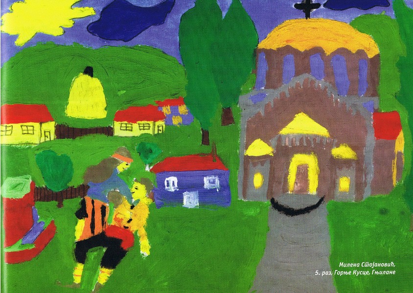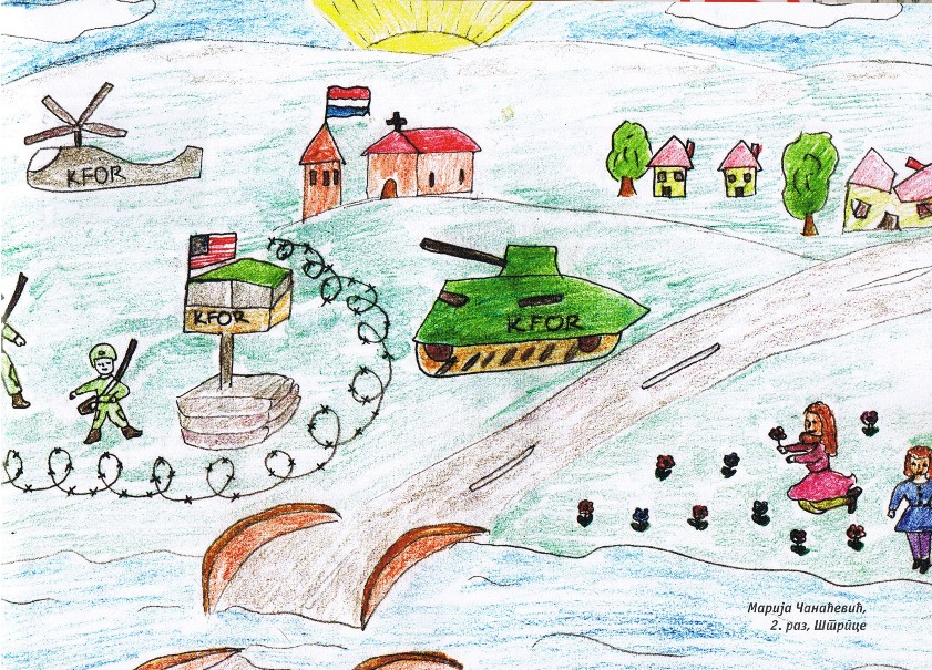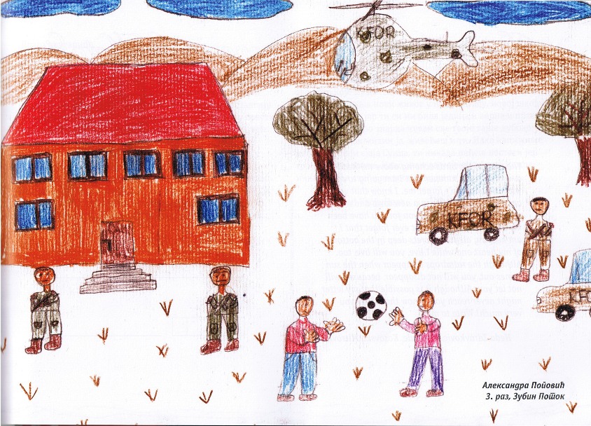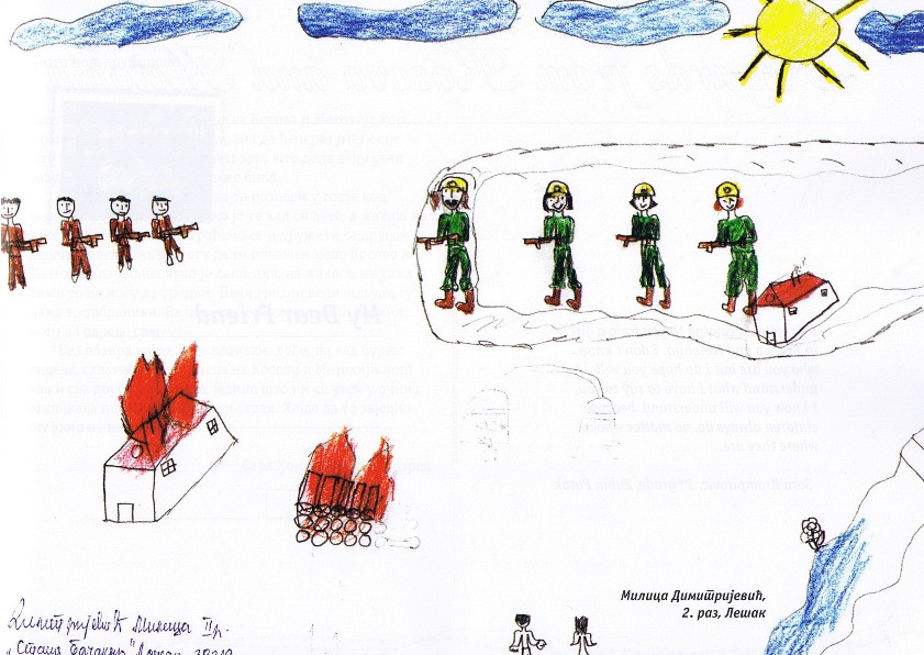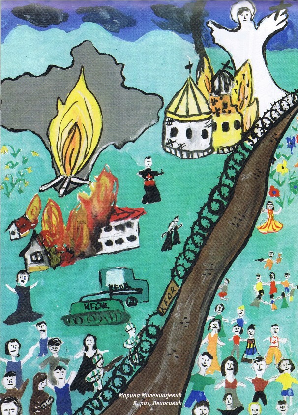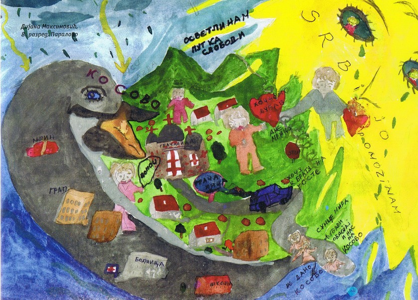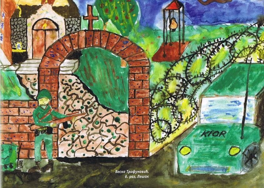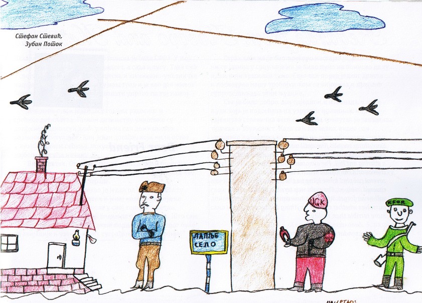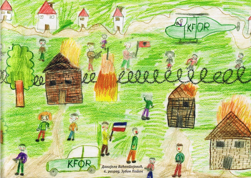 Цртежи деце са Косова и Метохије26.1.2019. Ситуација на Косову и Метохији је последње две деценије приказивана из много углова на многобројне начине: написано је безброј новинарских чланака, ТВ прилога, објава на интернет сајтовима и друштвеним мрежама, рађене су политичке и безбедносне анализе и процене, развијане дипломатске стратегије и правне формулације, снимљено је много фотографија, итд. Ипак, један необичан угао посматрања нам може помоћи да попунимо коцкице у мозаику које недостају. Ради се о цртежима српске деце са Косова и Метохије узраста основне школе у којима она осликавају своје тешко детињство, понекад са надом и оптимизмом, а понекад сурово реално и прерано сазрело, указујући на високу цену коју деца плаћају за калкулације великих.