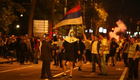 Policija je tokom nereda i posle njih u nedelju uvece na ulicama Beograda privela 179 osoba, medu kojima 48 maloletnika. U neredima je povredeno 11 gradana, 32 policajca, a osteceno je pet sluzbenih vozila i sest objekata. Prema saznanjima “Blica”, medu privedenima su navijaci Rada, Crvene zvezde i Partizana, ali u najvecoj meri pripadnici ekstremnih organizacija “Obraz” i Srpski nacionalni pokret “Nasi 1389”, ciji clanovi su pokrenuli i inicijativu za registraciju politicke partije. ![]() Slika sa ulica Beograda u nedelju uvece posle mitinga SRS