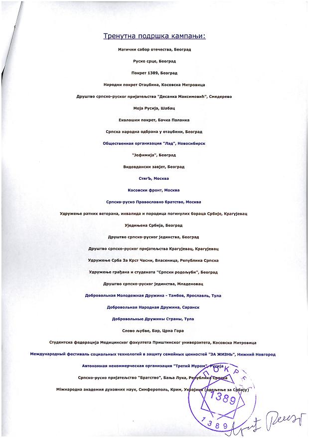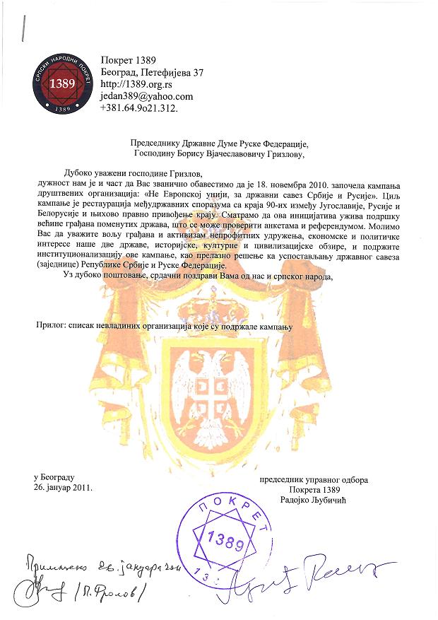 Кампања цивилног друштва "Не Европској унији, за државни савез Србије и Русије" је јануара 2011. наставила представљање пред државним органима. Након разговора у Скупштини Србије 12. јануара, две недеље касније, 26. јануара обављен је званични разговор са Амбасадом Руске Федерације. Трочлана делегација (у саставу: Радојко Љубичић, Борка Миланков-Црепуља и Јован Радојичић) је представила кампању господину Петру Фролову. Закључено је да треба поштовати међудржавне споразуме Русије, Белорусије и СР Југославије са краја 90-их година ХХ века. Такође, разјашњено је да Русија не подржава улазак Србије у ЕУ, већ подржава ону одлуку коју Србија буде донела. Ово је принципијелан став руске дипломатије.