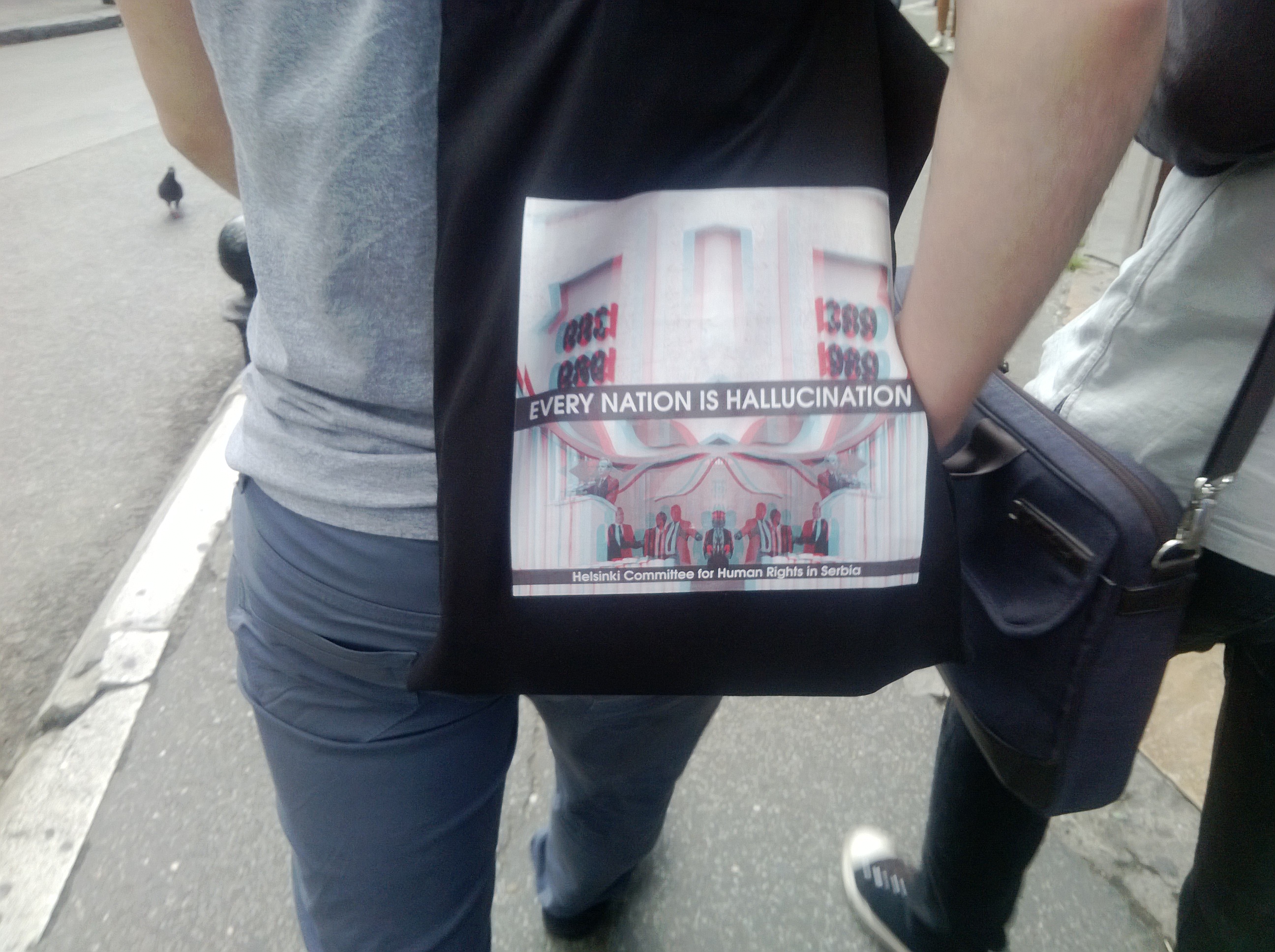Торба Хелсиншког одбора за људска правa? Helsinki Committee for human Rights in Serbia: Every nation is hallucination 08.06.2016. Питамо се какве везе има ова порука "Свака нација је халуцинација" на торби Хелсиншког комитета за људска права са заштитом људских права? Очигледно да се покушава повезати Бој на Косову са савременом политиком и национализмом, итд. Овде се поред осталог ради о злоупотреби градова са добром репутацијом: какве везе имају град Хелсинки и његови становници са Хелсиншким одбором за "људска права", или Лисабон са Лисабонским споразумом ЕУ или град Болоња (и чувени Болоњски универзитет) са Болоњском декларацијом о образовању, итд? Ради се о лукавим злоупотребама и манипулацијама. Евро-атлантизам - погледајте Снимљено у Сремској улици 2. јуна 2016. поподне: