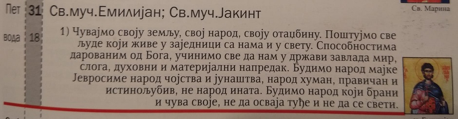 26. мај · Подељено са Јавно Годишњица смрти руског младог витеза Светог новомученика војника Евгенија Родионова. Убили су га Чечени када му је било само 19 година, након мучења. Није хтео да скине Крст око врата по цену живота. 26. мај · Подељено са Јавно Не дамо (вам) државу 3. део: Основни принципи: 1. Мирна, уставна и законита примопредаја власти, 2. Поштени избори, чисто бројање гласова, медијски простор равномерно, 3. Поштовање политичких неистомишљеника, признавање пораза, честитање победнику, власт формира онај ко освоји преко 50% гласова, 4. Медијски, политички, финансијски и на друге начине поштовати опозицију за време избора и ван кампањи, целе године, 5. Покушаји револуције и насилног преузимања власти су недопустиви, они су једна врста издаје, 5. колоне, тероризма, унутрашње окупације и неоколонијализма, 6. Држава има право и обавезу да силом брани уставно-правни поредак од агресивних покушаја узурпације, 7. Право је и дужност сваког грађанина и организације да бране државне јавне установе од револуционара, метежника, узурпатора, насилника. 25. мај · Подељено са Јавно Ништа не можемо да постигнемо ако нам неко стално у сред озбиљног посла (писање књиге или пројектовања зграде итд) на рачунару дође и ресетује систем и све поништи, упропасти рад и врати нас на почетак. Тако је исто и са револуцијама које ресетују један део историјског развоја, и што је још горе, често насилно, фанатично усмеравају државу у погрешном правцу, јер револуција је фанатизам, рушилачка снага која на кратке стазе може површне људе да импресионира, али дугорочно доноси озбиљне проблеме. 25. мај · Подељено са Јавно Економска сувереност Држава која је формално политички и међународно правно суверена, а нема развијену привреду подсећа на младића који је формално пунолетан и има 18 година, али је и даље потпуно завистан од родитеља, па када жели да изађе у град тражи од тате и маме паре за кафић и цигаре. То је пунолетство, али и даље несамосталност, слабост. 25. мај · Подељено са Јавно Последњи догађај од синоћ када је нападнут свештеник Никола Радовић испред Парохијског дома у Бару показује да је безбједност епископа и свештеника у Црној Гори озбиљно угрожена. Свештенику Николи је група младића дошла изпред дома, почела да урличе, виче, пријети. То је изазвало узнемирење нарочито код мале дјеце и супруге. На молбу оца Николе да се разиђу и иду својим путем, почели су да му псују српску мајку и да му пријете, помињући да попови убрзо више неће моћи по Црној Гори да се шетају. Ако томе додамо да је најбучнији из те групе био младић исламске вјероисповијести, онда видимо сву неозбиљност и неодговорност, на првом мјесту предсједника Ђукановића и премијера Марковића који цртањем мета владикама и свештеницима стварају амбијент који, надамо се, нико у Црној Гори не жели. Није ли ово плод Ђукановићеве злонамјерне и нетачне констатације да “Црква увози свештенике”? Случај је пријављен полицији. 24. мај · Подељено са Јавно Браво! Председник Америке Доналд Трамп да би решио проблем гувернера појединих држава који су демократе и противе се отварању цркава (наводно због вируса корона) донео је акт којим се Цркве проглашавају виталним, приоритетним објектима за Америку, који морају да раде и у ванредним ситуацијама, и чиме ће и демократски гувернери бити приморани да отворе цркве. По Трамп