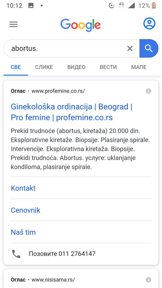 11. мај · Да ли је ово могуће, где ми живимо? Када на google тражите информације о абортусу прво се појави ова реклама клинике која убија дете, тојест врши абортус за 20.000 динара!?!?