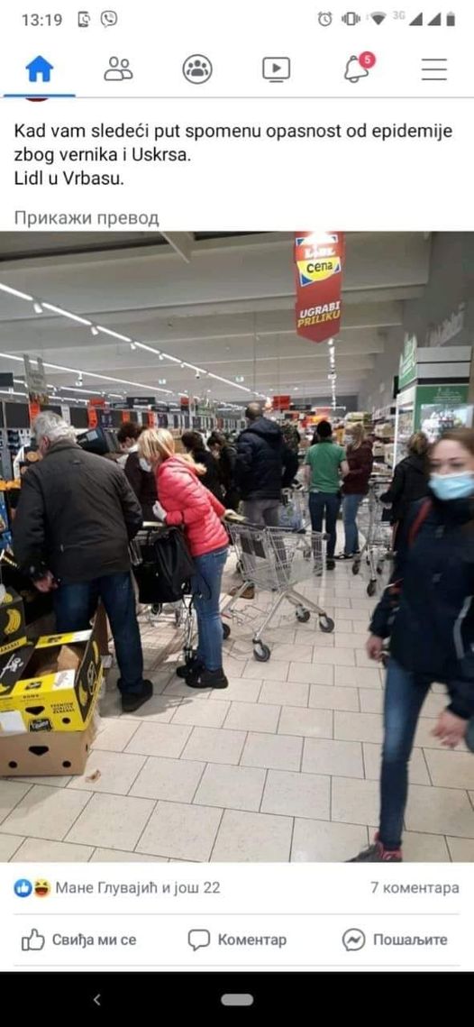 20.3.2020. at 12:49 AM · Свака част Православна браћо из Грузије! March 19 at 11:27 PM · Отпор (песница) не мирује, опет сањају о уништењу државе и слободе, о репресији. Ко жели основне слободе да укине? Какав је ово неофашизам?! Ако је ванредно стање, то не значи да болесни умови треба да искористе прилику да остварују своје садистичке и тоталитарне фантазије. Зар су људи пацови па да се врши дератизација (од) људи?! Панику и страх од вируса често шире велики медији, док друштвене мреже критички говоре о томе да се ситуација може злоупотребити за друге циљеве. Велики медији не могу и не желе да пренесу све информације и све утиске људи, њихове бриге, итд (зашто је РТС укинуо коментаре на свом порталу?), а друштвене мреже их ту допуњују. Људи мисле. Треба проверити колико је учешће овог човека и његових саучесника у терористичком чину револуције 5. октобра! Па шта хоће жутица данас: да људи цео дан седе испред телевизора и слушају вести и да им се испира мозак гебелсовим методама без права на своје мишљење? То је европска Србија за коју се залажу демократе, жалосне марионете Запада. Следећи је вероватно на реду да се појави Млађан Динкић да нас учи како да правимо касице-прасице да би штедели за маске и рукавице за будуће генерације, да их не би вирус Корона 2060 дочекао неспремне! Да ли је ово могуће? Twilight zone ?? Marketinski strucnjak Nebojsa Krstic predlozio je danas da se drustvene mreze Tviter, Fejsbuk i Jutjub iskljuce u Srbiji za vreme vanrednog stanja kako bi se, kako je naveo, suzbila epidemija sirenja panike i sprecili njeni potencijalno smrotnosni efekti. Krstic je u redovnoj kolumni za B... About this website NEDELJNIK.RS "Predlazem ukidanje Tvitera, Fejsbuka i Jutjuba u Srbiji za vreme vanrednog stanja": Nebojsa Krstic o ideji za akciju "Dezinfekcija i deratizacija" Marketinski strucnjak Nebojsa Krstic predlozio je danas da se drustvene mreze Tviter, Fejsbuk i Jutjub iskljuce u Srbiji za vreme vanrednog stanja kako bi se, kako je naveo, suzbila epidemija sirenja panike i sprecili njeni potencijalno smrotnosni efekti. Krstic je u redovnoj kolumni za B... March 19 at 6:05 PM · Play -0:18 Additional Visual Settings Enter Watch And ScrollClick to enlarge Mute 1,780 Views Ignaty Shestakov March 18 at 11:22 PM March 18 at 8:28 PM · Прави "вирус" који угрожава Европу су кинеска економија и арапска демографија, а не Корона. Али маске и рукавице нису решење за то. Европски народи имају негативан природни прираштај и чак да нико не живи у Азији и Африци то би само успорило изумирање старог континента. Болестан може да мрзи здравог, и чак да му напакости, али то није решење. У чему је решење? Повратак приватном и јавном моралу, повратак личној и јавној вери. Без оба два чиниоца изумиру породице и нације. Неморално понашање директно производи бесплодност, док религиозност производи породичност и наталитет. March 18 at 8:27 PM · Сад је време да се сетимо старијих рођака и комшија, да их позовемо и понудимо им помоћ у набавци хране, лекова итд и да им пружимо сваку могућу подршку, да се не осете занемареним и пониженим. Иначе, у Србији се слабо поштују и слушају старији, већ се млади често праве паметнији. Радојко Љубичић Требало би да се односимо пажљиво према души сваког човека. Edit or delete this Like · Reply · 2d Olgica Nesic Active Now Olgica Nesic Како ко и како где "селекција" March 17 at 7:27 PM · СА ВЕРОМ, БЕЗ ПАНИКЕ! Ево нас драга браћо и сестре, пријатељи, непријатељи, познаници и странци пред изазовом које носи живот. За нас православне хришћане таква појава давно је и јасно дефинисана као искушење. Искуство цркве формирано на основу животних примера светих (најбољих хришћана) није нам оставило ни један други пут, осим пута препознавања искушења и борбе са њим. У освиту нових технологија и достигнућа која су засигурно човека подигла в