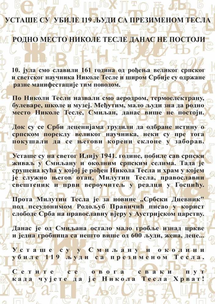 Косово и Метохија 11. јул у 10:01 · Четрнаест мушких глава фамилије Костић из Ретимља убијено је од 10. до 17.07.1998. године КОСТИЋ Драгољуб САШКО, СРБИН ИЗ ОРАХОВЦА, РОЂЕН 14.01.1976. У ОРАХОВЦУ, КИДНАПОВАН 17.07.1998. ИЗ ОРАХОВЦА. КОСТИЋ Драгољуб ЈУГОСЛАВ, СРБИН ИЗ ОРАХОВЦА, РОЂЕН 06.01.1970. У ОРАХОВЦУ, КИДНАПОВАН 10.07.1998. ИЗ ОРАХОВЦА. КОСТИЋ Никола МЛАДЕН, СРБИН ИЗ ОРАХОВЦА, РОЂЕН 22.02.1940. У ОРАХОВЦУ, КИДНАПОВАН 17.07.1998. ИЗ ОРАХОВЦА. КОСТИЋ Младен НЕБОЈША, СРБИН ИЗ ОРАХОВЦА, РОЂЕН 12.03.1980. У ОРАХОВЦУ, КИДНАПОВАН 17.07.1998. ИЗ ОРАХОВЦА. ПОСМРТНИ ОСТАЦИ ПРЕДАТИ 13.10.2006. КОСТИЋ Анђелко ЖИВКО, СРБИН ИЗ ОРАХОВЦА, РОЂЕН 15.05.1976. У ОРАХОВЦУ, КИДНАПОВАН 17.07.1998. ИЗ ОРАХОВЦА. ПОСМРТНИ ОСТАЦИ ПРЕДАТИ 13.10.2006. КОСТИЋ Божидар ЛАЗАР, СРБИН ИЗ ОРАХОВЦА, РОЂЕН 08.03.1972. У ОРАХОВЦУ, КИДНАПОВАН 17.07.1998. ИЗ ОРАХОВЦА. ПОСМРТНИ ОСТАЦИ ПРЕДАТИ 13.10.2006. КОСТИЋ Божидар ТОДОР, СРБИН ИЗ ОРАХОВЦА, РОЂЕН 30.07.1965. У ОРАХОВЦУ, КИДНАПОВАН 17.07.1998. ИЗ ОРАХОВЦА. ПОСМРТНИ ОСТАЦИ ПРЕДАТИ 13.10.2006. КОСТИЋ Душан ДИМИТРИЈЕ, СРБИН ИЗ ОРАХОВЦА, РОЂЕН 24.10.1932. У ОРАХОВЦУ, КИДНАПОВАН 17.07.1998. ИЗ ОРАХОВЦА. ПОСМРТНИ ОСТАЦИ ПРЕДАТИ 13.10.2006. КОСТИЋ Димитрије МИРОЉУБ, СРБИН ИЗ ОРАХОВЦА, РОЂЕН 28.08.1967. У ОРАХОВЦУ, КИДНАПОВАН 17.07.1998. ИЗ ОРАХОВЦА. ПОСМРТНИ ОСТАЦИ ПРЕДАТИ 13.10.2006. КОСТИЋ Младен ВИТОМИР, СРБИН ИЗ ОРАХОВЦА, РОЂЕН 28.05.1928. У ОРАХОВЦУ, КИДНАПОВАН 17.07.1998. ИЗ ОРАХОВЦА. ПОСМРТНИ ОСТАЦИ ПРЕДАТИ 13.10.2006. КОСТИЋ Димитрије ВЕКОСЛАВ, СРБИН ИЗ ОРАХОВЦА, РОЂЕН 28.10.1958. У ОРАХОВЦУ, КИДНАПОВАН 17.07.1998. ИЗ ОРАХОВЦА. ПОСМРТНИ ОСТАЦИ ПРЕДАТИ 13.10.2006. КОСТИЋ Стајко СВЕТИСЛАВ, СРБИН ИЗ ОРАХОВЦА, РОЂЕН 02.06.1960. У ОРАХОВЦУ, КИДНАПОВАН 17.07.1998. ИЗ ОРАХОВЦА. ПОСМРТНИ ОСТАЦИ ПРЕДАТИ 13.10.2006. КОСТИЋ Стајко МИОДРАГ, СРБИН ИЗ ОРАХОВЦА, РОЂЕН 19.09.1965. У ОРАХОВЦУ, КИДНАПОВАН 17.07.1998. ИЗ ОРАХОВЦА. ПОСМРТНИ ОСТАЦИ ПРЕДАТИ 13.10.2006. КОСТИЋ Станоје СРЕЋКО, СРБИН ИЗ ОРАХОВЦА, РОЂЕН 29.01.1974. У ОРАХОВЦУ, КИДНАПОВАН 17.07.1998. ИЗ ОРАХОВЦА. ПОСМРТНИ ОСТАЦИ ПРЕДАТИ 13.10.2006. http://kosovo-metohija.com/index.php/component/k2/item/1604-страдање-фамилије-костић-из-ретимља 11. јул у 11:24 · Krajina je bila granica izmedu dva carstva u duzini od oko 1750 km. Prostirala se od Jadrana do Karpata. Granicari, krajisnici, uglavnom Srbi, vekovima su branili i odbranili Hriscanstvo u Evropi pred osmanskim carstvom zla. Osvetili su cara Lazara, Jug Bogdana, Milos Obilica, Ivana Kosancica i ostale junake iz boja na Kosovu 1389. U sastavu Krajine tog doba je bio Novi Sad, Zemun, Sremska Mitrovica, Pancevo, Beograd i mnogi drugi gradovi danasnje Srbije. Zbog svirepog progona, mucenja i stalnih pljacki od strane osmanlija u Krajini je u odredenim vremenskim periodima bilo vise Srba nego u matici. #teslinnarod #slobodnakrajina 11. јул у 14:23 · Подељено са Јавно Лажна вест оних који желе да изазову грађански рат у Србији. Будимо мудри као змије и безазлени као голубови. Милица Ђурђевић 9. јул у 15:49 · Ако власт преко својих медија и аналитичара тврди да је руши Русија, онда то значи да они сами признају да имамо НАТО Владу. Изгубили сте компас, па вам је крива Русија. Вероватно, јер није признала независност тзв. Косова, јер није дозволила да наше светиње одузму сецесионисти, јер је ставила вето на британску Резолуцију о геноциду у Сребреници, јер нас није бомбардовала осиромашеним уранијумом, јер нема војну базу у Србији, јер довршава и украшава Храм Светог Саве, јер је послала 11 теретних авиона хуманитарне и медицинске помоћи, јер брани интегритет Републике Српске, јер се позива на Резолуцију 1244, јер не допушта комадање, разграничавање и деобу српске територије. Ко неће брата за брата, имаће туђина за господара. 8. јул у 16:30 · Подељено са Јавно Изгледа да су значајни делови "жуте" београдске грађевинске мафије успели да претрче у табор напредњака, а Весић је мо