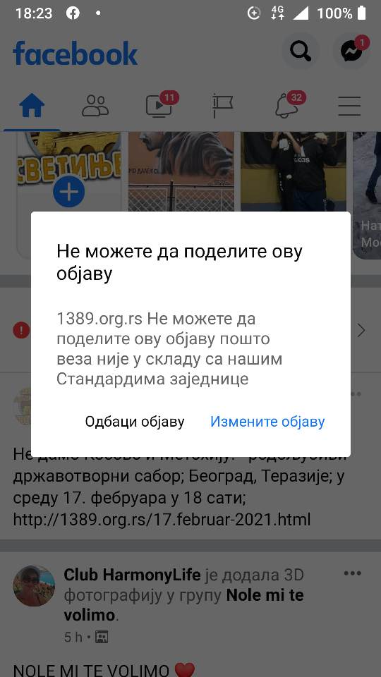 Фејсбук цензурише 1389 14.2.2021. Фејсбук цензурише 1389! Фејсбук није дозволио 13. фебруара 2021. око 18:20 објављивање вести са позивом на јавни нестраначки скуп грађана "Не дамо Косово и Метохију!" и линком ка сајту покрета 1389 јер се то не слаже са "Стандардима заједнице"?! При томе није наведено какви су то конкретно стандарди. Да ли Фејсбуку смета ангажман против независности Косова и Метохије? Или само удружење које има државотворне принципе и противи се уласку Србије у ЕУ и НАТО? Или је проблем дугогодишња сарадња са Русијом? Како год, Фејсбук је показао своје право недемократско лице и своју пристрасност; цензуру и нетрпељивост према онима који мисле другачије. Каква је то Фејсбук "заједница"? Ко су њени чланови, ко одређује правила, каква је њена етика, има ли ту расизма против Словена (Срба и Руса) иако се амерички медији хвале борбом против расизма који вређа црну расу. Шта је са антисловенским расизмом који је био карактеристичан и за нацисте у време Другог светског рата? Фејсбук би требао да буде неутрална и објективна платформа са јасним вредностима и правилима. Уколико имају замерке на одређена удружења или појединце онда то треба јасно навести. Управа Фејсбука се понаша као велики брат односно диктатор унутар велике мреже без правила и етике као неко ко може било ког корисника или групу избацити по сопственој самовољи. Да ли је то демократски? Да ли Фејсбук нарушава принципе монопола тиме што контролише огроман проценат тржишта друштвених мрежа без адекватне конкуренције? Подсећамо да је Фејсбук раније укинуо групу Покрет 1389 са око 8 хиљада чланова због изражавања добродошлице доласку председника Русије Владимира Путина у Србију у службену посету. Ево и скриншота последњег инцидента: