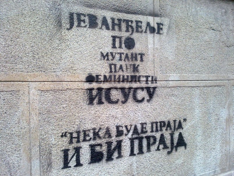 Геј парада изазива верску нетрпељивост 21.08.2014. Однос протагониста геј параде у Београду према Православљу и уопште Хришћанству је прешао границе морала и закона и прешао у сферу отвореног изазивања верске нетрпељивости и мржње што је строго забрањено Уставом Републике Србије. Очигледно да геј активисти не могу да поднесу своје неистомишљенике. Ево једног графита који смо затекли и фотографисали у центру Београда 30. јуна ове године и који вређа и понижава све вернике. Исмевају се Свето Писмо (Библија) и његов најсветији део Јеванђеље. Исус Христос који је за Православце Бог се вређа и понижава клеветама и примитивизмом. Несрећни менаџери геј-параде (такозваног прајда) имају отворену подршку амбасада западних држава и то злоупотребљавају да крше закон и Устав Србије, да понижавају са подсмехом и да се иживљавају над обичним, мирним савесним грађанима Србије који то морају све да трпе, јер нису ничим привилеговани у нашем систему. Ево чланова Устава који су повређени овим неделом: Члан 49. Члан 55.