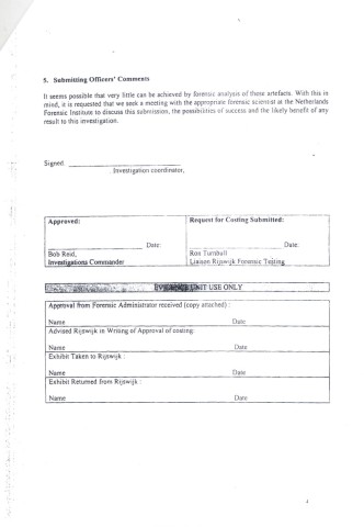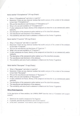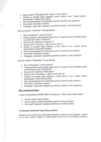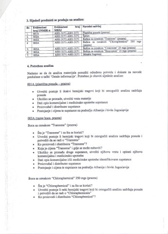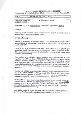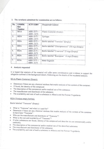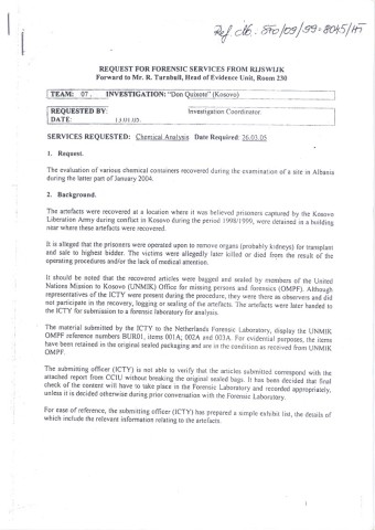 U dokumentu od 13. januara 2005. do kog smo dosli, a koji je sluzbeno u Hagu zaveden pod oznakom SFO/09/99-8045, Bob Rid, zamenik glavnog haskog istrazitelja, trazi da se urade hemijske analize sumnjivih predmeta pronadenih u „zutoj kuci". Dalje se nabraja sta je sve poslato na analizu: plasticne posude, prazne boce sa oznakom lekova „tranxene", „chlooraphemical", „cinarizine" i „biscopean" (preparati koji se koriste pri operacijama, prim. ur.), kao i „metalne krhotine koje odgovaraju hirurskoj opremi".