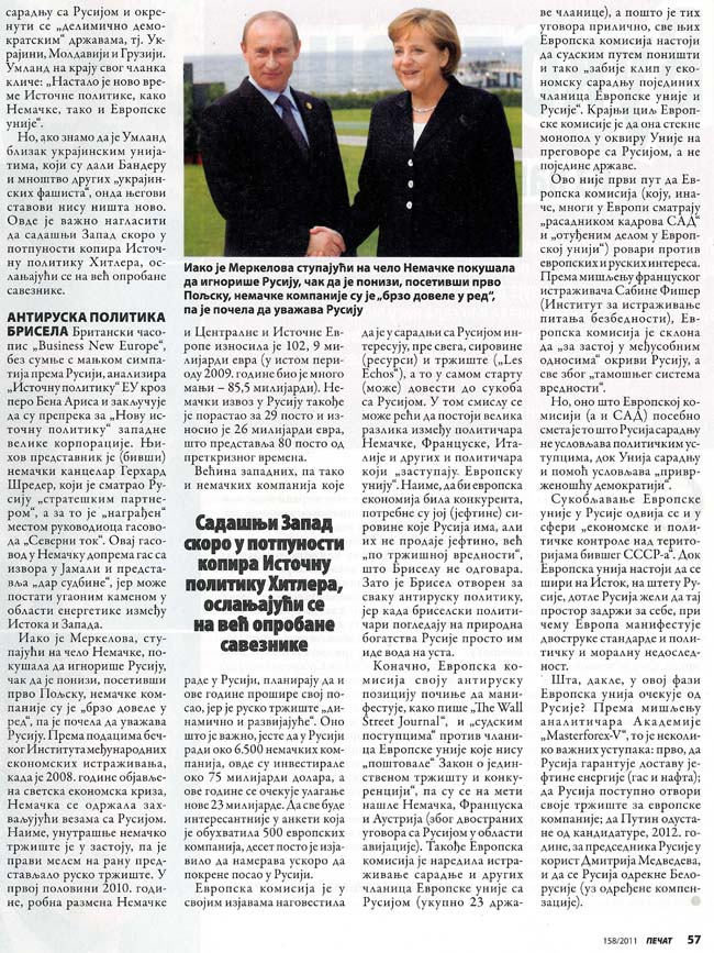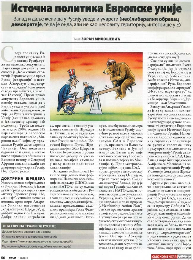 Источна политика ЕУ11.04.2011. Одличан чланак у недељнику Печат, број 158 од 25. марта 2011. (стране 56 и 57). Из неког разлога овај текст се није нашао на интернет презентацији листа Печат, стога је скениран и представљен заинтересованима у оваквом, електронском облику.