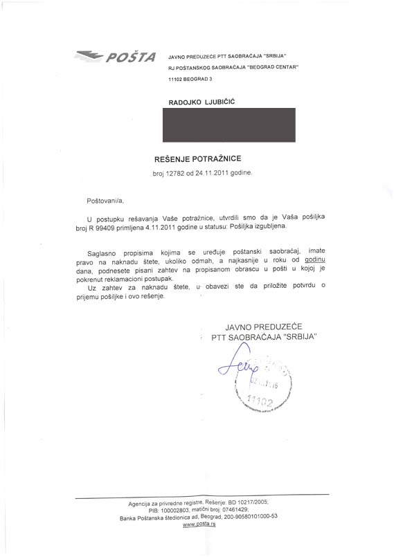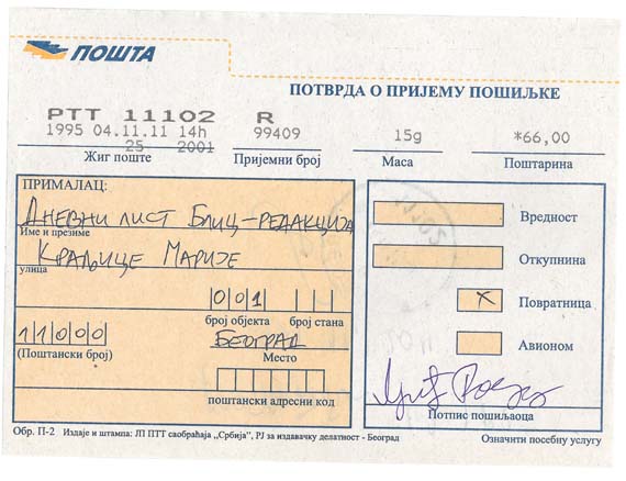 П.С. молимо Вас да овај деманти објавите у целости и да нам обезбедите штампани примерак Вашег листа као доказни материјал. Поздрав