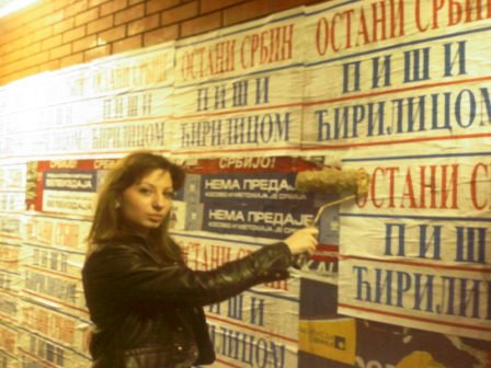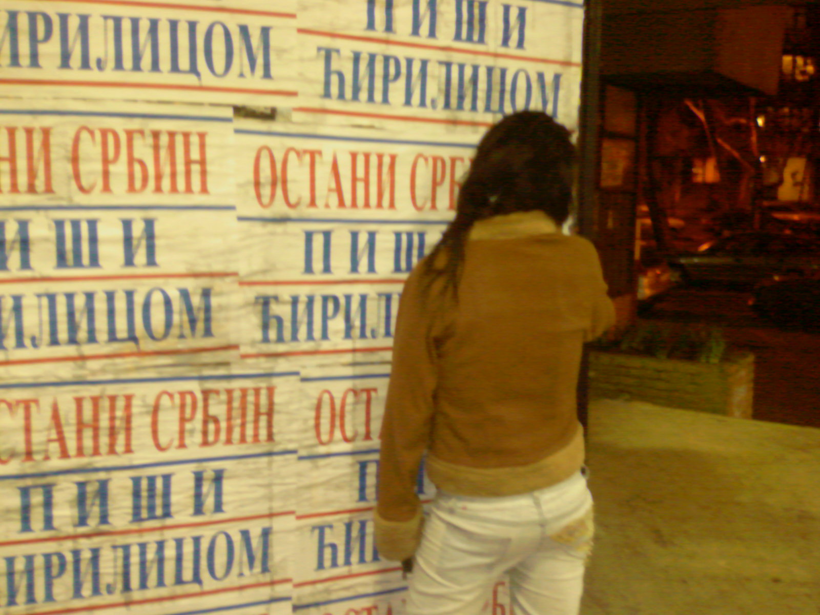 понедељак 12.03.2007. Плакати су штампани у црвено, плаво, белој техници. У складу са нашим основним начелима: "ћирилично писмо" и "очување чистоте и богатства српског језика" изведена је акција плаката "Остани Србин ПИШИ ЋИРИЛИЦОМ". Иако је по новом Уставу Србије званично писмо ЋИРИЛИЦА, оно се у свакодневној употреби све више гуши и замењује латиницом. С циљем и жељом за подстрекивање народа нашег да пише својим писмом извели смо ову акцију. Намерно не потписујући се на плакату, јер сматрамо да је ћирилица и право на борбу за њено очување опште народна ствар културе и националне свести Срба. Захваљујемо се господину Немањи Видићу који је о свом трошку штампао плакате и омогућио да се ова акција изведе. Догодине у Книну (с ЋИРИЛИЦОМ)! Током априла кампања "Остани Србин пиши ћирилицом" је захватила многе делове града; у заштиту српског културне баштине су стали наши пријатељи и сарадници: Фамилија србских навијача, Деца Србије и Истина о Србији, који су покрили плакатима остале делове града. Сложно и снажно за Србију! Слике са терена:
