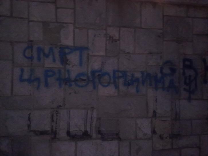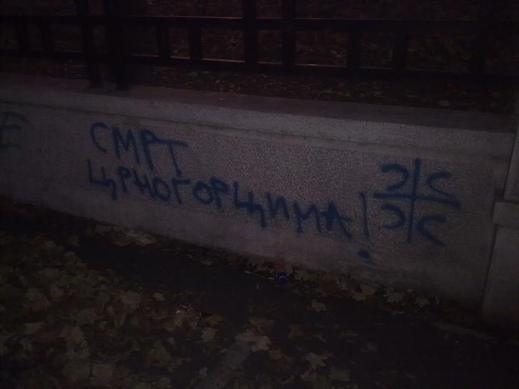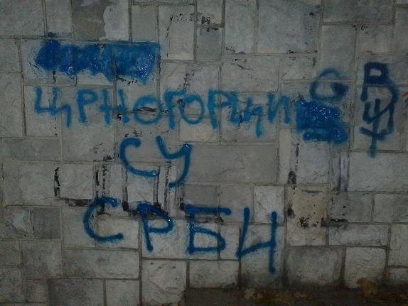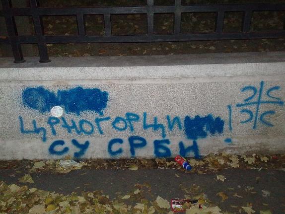 Предизборна кампања и избори у Црној Гори су се одразили и на Србију - на жалост има и лоших примера. Октобра 2012. група (инструисаних) непознатих провокатора је по ужем центру Београда направила графите са поруком: "смрт Црногорцима" уз крст са четири оцила!? Ови графити су требали да постигну ефекат мржње и подгревања непотребног сукоба између Срба који живе у Србији и Срба у Црној Гори. Порука "смрт Црногорцима" никако не сме да постоји у Београду, а пошто градске и републичке власти нису реаговале неколико дана, "1389" је прецртао ове графите и преправио их на нову поруку: Црногорци су Срби. Мржња према нашој браћи која живе у Црној Гори нема никакве везе са национализмом, без обзира на државни знак који се поред графита поставио. 1389 ће се увек борити против даљег цепања српског етноса и стварања сукоба који иду на руку само онима који желе споља да владају овим просторима и да експлоатишу наше ресурсе. Црна Гора је географска област у којој већински живи српски народ и говори српским језиком. Борићемо се доследно против измишљања нових језика, "цркава", народа и историја преко леђа српског народа и против даљег насилног комадања народног ткива, сепаратизмима разних типова осмишљеним и финансираним са запада.