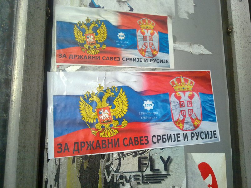 Изведене акције - погледајте Налепнице штампане у боји формата: 1/6 А4 и 1/10 А4 Покрет 1389 већ годинама води кампању за државни савез Србије и Русије на веома различите начине. Једна од метода борбе, с обзиром на наша веома скромна финансијска средства, су налепнице, стога ова акција траје дуго времена - у континуитету. Циљ је да се обичном народу као што смо ми, скрене пажња да нам је Русија најближи и најискренији и најпоузданији савезник била кроз историју и остала данас. Она није савезник који нас бомбардује и убија наше грађане ради својих циљева, већ је напротив себе жртвовала често зарад помоћи својој млађој сестри Србији. Веома је важно да се сетимо историје у годину када обележавамо 100 година од почетка Првог светског рата, који је започео тиме што је руски цар Николај II Романов објавио рат Немачком и Аутроугарском царству како би заштитио Србију, које је тада била мања него данас.