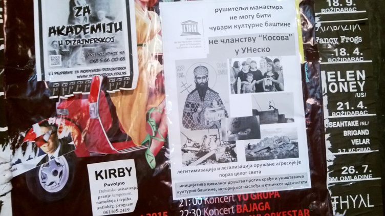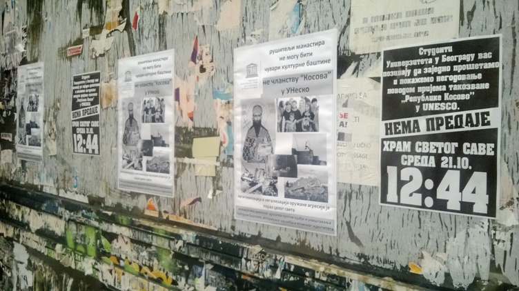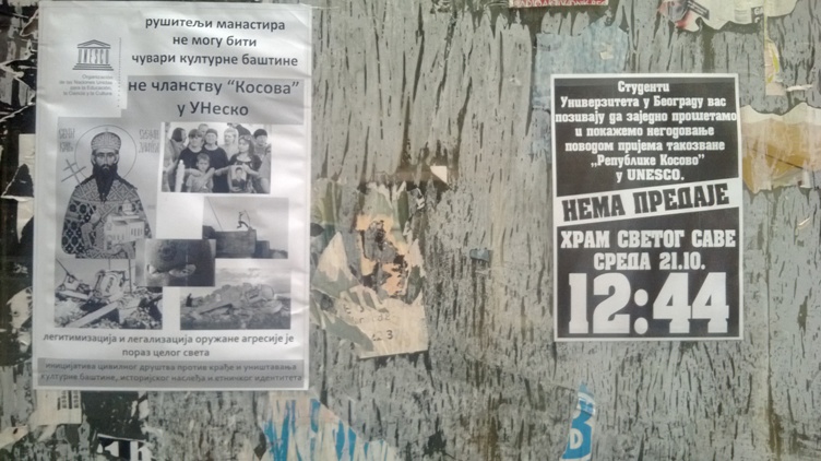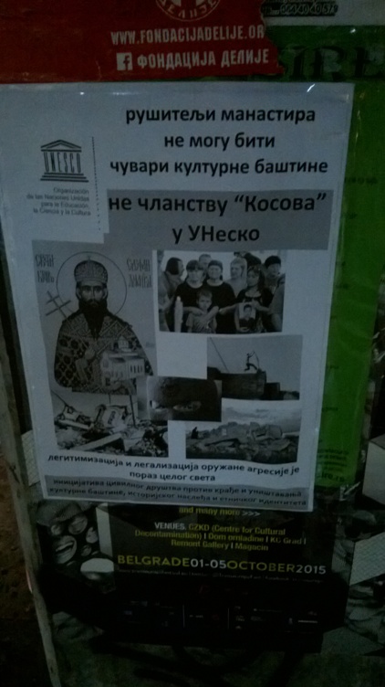 средина октобра 2015. Најава гласања у седишту УНеско-а у Паризу о пријему такозване државе "Косово" у чланство изазвала је снажну реакцију у Србији: одлучно се против ове неправде, неморала, бесмислице и беззакоња иступили: Црква, председник државе, Влада Србије, цивилно друштво, итд. Покрет 1389 се укључио са своје позиције удружења грађана (невладине организације) у кампању цивилног друштва против крађе и уништавања културне баштине, историјског наслеђа и етничког идентитета. Имресивне су акције студената Београдског универзитета које смо подржали (линк).