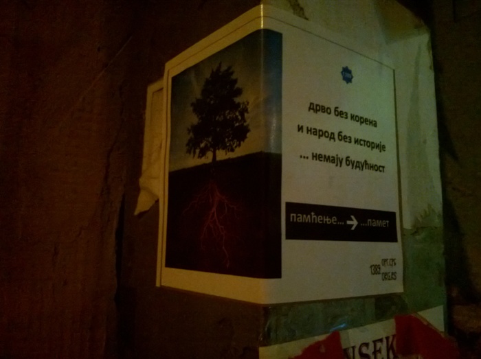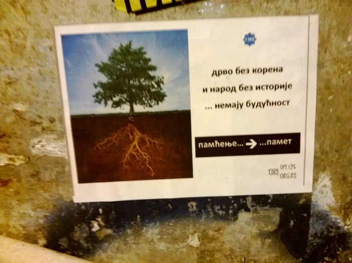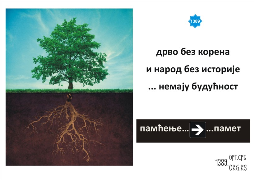 Новембра месеца Покрет 1389 је донео решење да покрене кампању "Дрво без корена и народ без историје немају будућност" усвојивши при томе и графичко решење. Одлучили смо се на овај корак због разних идеолошких и политикантских кампања и опште хистерије по којој Србија жури у будућност - и јури и лети у ту будућност - уз опасност да поломи ноге јурећи некакав брзи воз који само што није кренуо за Брисел. Па нека иде тај воз ако у њега треба да улете суманути путници без поноса и здравља, без националног идентитета и части, без историје и традиције, без вере и ћирилице, без Косова и Метохије. Такав воз нам не треба. То је још једна велика историјска превара и обмана намученог народа. Без самопоштовања ни други нас неће поштовати. Без труда и рада ни други неће радити уместо нас. Без познавања своје историје осуђени смо да понављамо исте грешке на вечитом историјском поправном испиту у августу. Без Косова и Метохије ми смо празне љуштуре. Нема разлога да се ми стидимо својих славних предака, већ они могу да се стиде ове - једне од најгорих генерација у историји српског народа, генерације која само тражи и кука, а скоро ништа не ствара што би могло бити поносно наслеђе за будуће генерације. Када крене јака олуја тада се дрво слабог корена или без корена обара и пада. Исто тако, када крену велике историјске невоље и муке народ који нема утемељење у својој историји, култури и духовности пада и пропада.