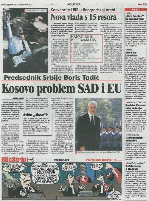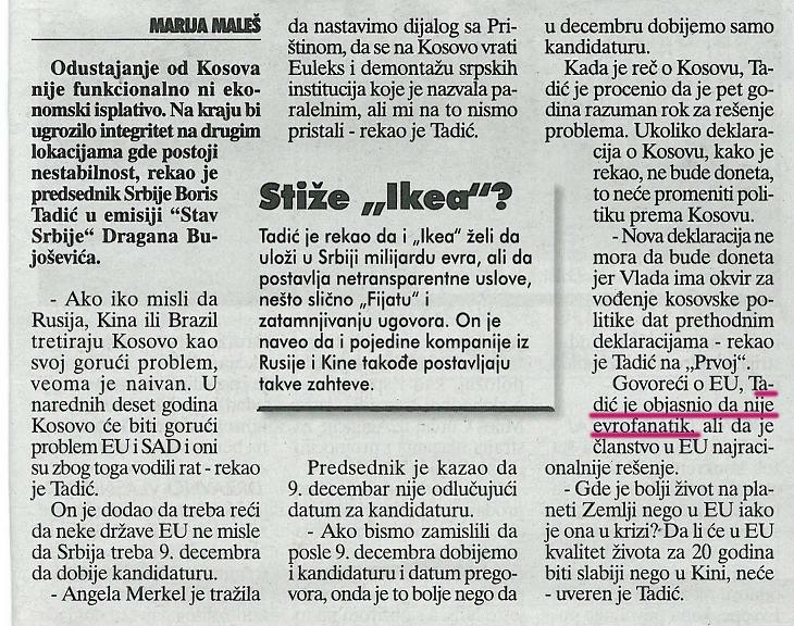 Евро-атлантизам - погледајтеВерзија чланка са интернета (нешто измењена): Tadic: Ko misli da je Kosovo za Rusiju goruci problem, taj je veoma naivanAko iko misli da Rusija, Kina ili Brazil tretiraju Kosovo kao svoj goruci problem jeste veoma naivan. U narednih deset godina Kosovo ce biti goruci problem EU i SAD i oni su zbog toga vodili rat, izjavio je predsednik Srbije Boris Tadic.