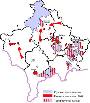 Детаљи: 17. марта 2004. године албански екстремисти су запосели станицу УНМИК полиције у насељу "Врањевац" и запалили више полицијских теренских возила. Истог дана, нападнута је зграда "ЈУ програма", у којој је живела већа група Срба. Албански екстремисти су зграду запалили, а око 30 грађана српске националности склонило се у један стан, како би се заштитили. Након више покушаја, снаге КФОР-а евакуисале су угрожене Србе у своју базу, а лица српске националности запослена у администрацији УНМИК-а, пребачена су на подручје централне Србије. Запаљена је и црква Светог Николе. У Приштини више нема Срба.