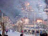 Косовска Митровица. Косовска Митровица: Албанци запалили српску цркву, етнички чисте Србе уништавају српске куће. Град је подељен на северни и јужни део, при чему је јужни део настањен искључиво албанским становништвом, док је северни део града мултиетнички, односно у насељима "Три солитера", "Микро-насеље" и "Бошњачка махала" живе Срби, Албанци, Роми и Бошњаци. Општи подаци: Број Срба до доласка КФОР-а: око 16.000