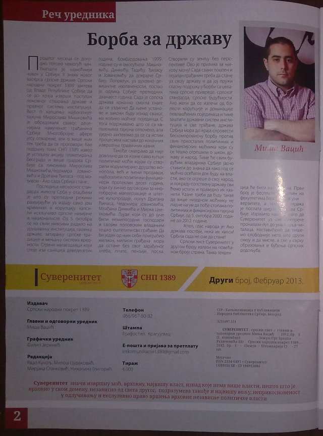 Миша Вацић наставља да са несрећним сарадницима обмањује јавност и да се лажно представља као лидер покрета "1389". Тако незаконито деловање му је омогућила (регистровањем и не забрањивањем) администрација Бориса Тадића, а подршку наставља и администрација Александра Вучића. Један од последњих корака је издавање листа "Суверенитет" од стране Мише Вацића, а у име "1389"! Наравно, немамо ништа против да Миша Вацић издаје новине и да се бави новинарством, али никако у име "1389".