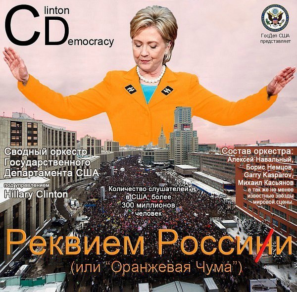 Наранџаста симфонија Хилари Клинтон01.09.2012. Наранџаста боја је у Русији симбол украјинске револуције, тојест свргавања сувереног државног поретка под утицајем (и финансирањем и организовањем) западних сила зарад стављања независне државе под контролу истих сила. Извор: http://vk.com/centrprotivodeystviya Поредак - антиреволуция - погледајте