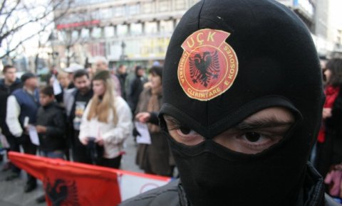 Тројица маскираних младића у црним кожним јакнама са ознакама такозване Ослободилачке војске Косова стајали су испред рампе на којој су висиле албанска застава и застава Европске уније.