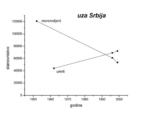 По последњим обрађеним подацима Републичког завода за статистику, у Србији је у 2002. години рођена 78 101 беба, а умрло је 102 785 особа.