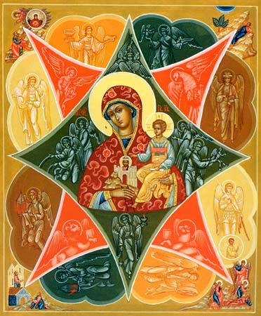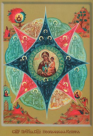 Осмокрака звезда"Несагорива купина": Православно изображавање сабора Пресвете Богородице Распеће Христово у Студеници. Свети Дух у обличју белог голуба. «Спас Благое Молчание - очень редко встречающийся иконографический тип образа Спасителя. Икона изображает Христа до прихода к людям, до воплощения, Ангела Великого Совета. Спаситель изображен в ангельском чине, в виде крылатого юноши в белой далматике с широкими рукавами. Руки сложены и прижаты к груди. Отличительная особенность данного образа - восьмиконечный (а не кресчатый, как у других типов икон Христа) нимб, нимб Господа Саваофа.