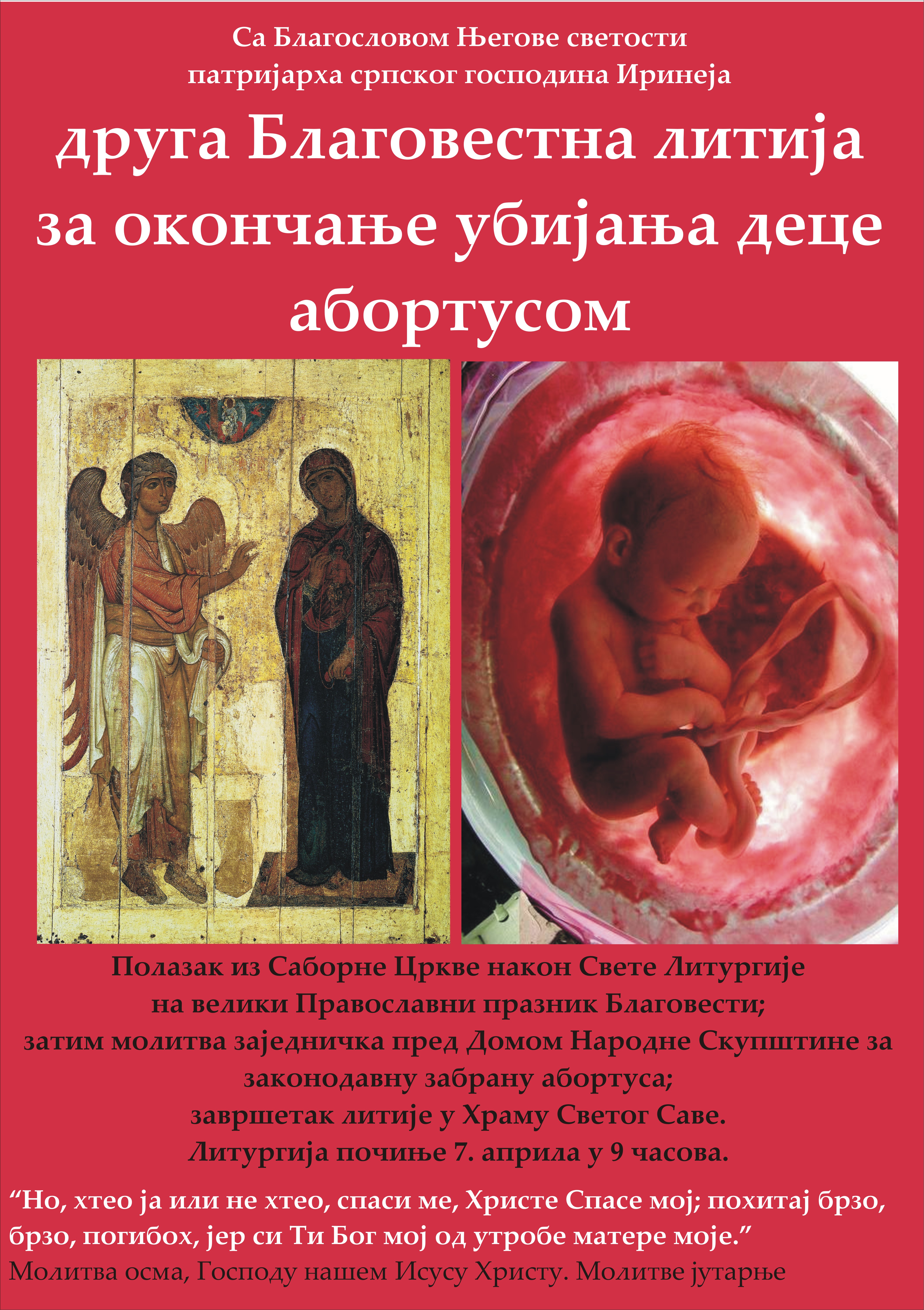 Патријарх Иринеј поново благословио Благовестну литију за забрану абортуса 21.02.2015. Његова светост патријарх српски господин Иринеј дао је и ове године свети архијерејски Благослов за Благовестну литију за забрану абортуса улицама престонице. Документ АЕМ бр. 176 од 16. фебруара 2015. године помиње и делегацију Руске православне цркве и удружење За живот из Москве као могуће госте које треба достојно прихватити. Овим је још једном потврђено јасно и недвосмислено опредељење наше Цркве да је абортус зло и убиство коме нема места у нашем друштву. Позивамо све да велики празник живота и настанка новог живота Благовести проведемо како је по Божијој вољи - прво на Литургији, а после Литургије у Саборној цркви (почиње у 9 часова) да кренемо заједно у свету литију ка Народној скупштини и Храму Светог Саве да бисмо се изборили за свето право нерођене деце на живот, на рађање и срећно детињство. Благовестна литија за забрану абортуса 2014 - погледајте Међународна иницијатива за забрану абортуса - детаљније постер у високој резолуцији - линк