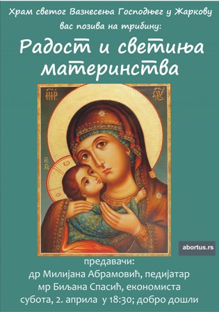 Предавање у Жарковачкој Цркви о абортусу 10.4.2016. Предавање, у суботу после бдења, је било врло емотивно и потресно, јер је и тема таква да је скоро немогуће остати равнодушним. Мр Биљана Спасић и ђакон Александар су говорили о чињеницама, здравственом аспекту, последицама на породицу, духовном смислу и другим аспектима абортуса. Упућен је позив присутнима на трећу Благовестну литију 2016.