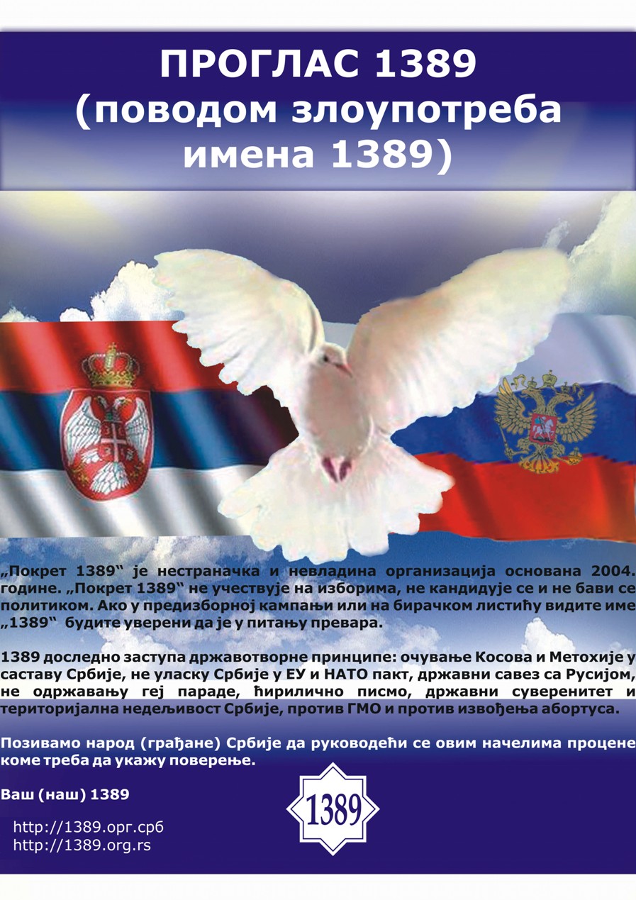 Проглас 1389 поводом злоупотребе имена07.10.2013. ПРОГЛАС 1389 „Покрет 1389“ је нестраначка и невладина организација основана 2004. године. „Покрет 1389“ не учествује на изборима, не кандидује се и не бави се политиком. Ако у предизборној кампањи или на бирачком листићу видите име „1389“ – будите уверени да је у питању превара. 1389 доследно заступа државотворне принципе: очување Косова и Метохије у саставу Србије, не уласку Србије у ЕУ и НАТО пакт, државни савез са Русијом, не одржавању геј параде, ћирилично писмо, државни суверенитет и територијална недељивост Србије, против ГМО и против извођења абортуса. Позивамо народ (грађане) Србије да руководећи се овим начелима процене коме треба да укажу поверење. Ваш (наш) 1389