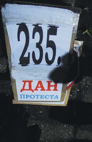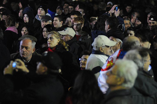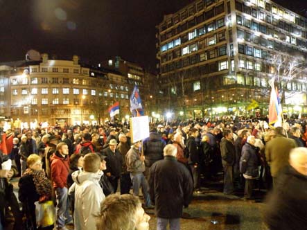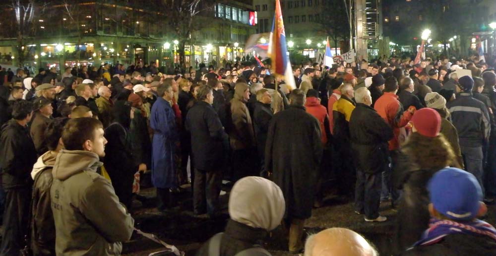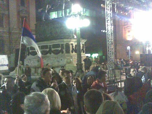 Поново се показало да се вером и вољом може много урадити и без великих фондова и донација. Промишљеном и пожртвованом кампањом привучен је велики број људи на обележавање 10-огодишњице НАТО бомбардовања. Неколико хиљада људи је већ неколико минута након 18 часова испунило Трг републике. Скуп је отворио хор студената Београдског универзитета песмама на српском и руском језику. Након тога је прочитана молитва за спас српског народа, што је већ традиција свакодневних окупљања на Тргу републике. Зачуле су се и химне Србије и Русије као најбоља потврда државотворности скупа и поништавања евро-атлантских интеграција. Присутни су здушно поздравили Сашу Ходоровског, делегата наше братске организације, руског удружења НАШИ, који је истакао приврженост руске омладине својој српској браћи, жал због злочина који су се десили насупрот међународном праву пре 10 година, али и нужност знатног појачавања међусобне сарадње што је жеља оба народа. На жалост, велики део програма нисмо били у стању да изведемо због бројних сметњи које смо претрпели, па и физичких напада провокатора које је наша редарска служба некако обуздала. Полиција је овога пута лоше одрадила свој посао: скоро ништа на безбедности скупа није урађено, неке учеснике скупа Полиција је безразложно претукла након скупа, али зато бесмислене пријаве и тужбе се против Покрета 1389 редовно подносе судовима. Ближи се крај евро-атлантског режима. Други део скупа, након 19 часова организовао је Народни покрет Србије. Захваљујемо свима који су присуствовали скупу или помогли његово организовање.