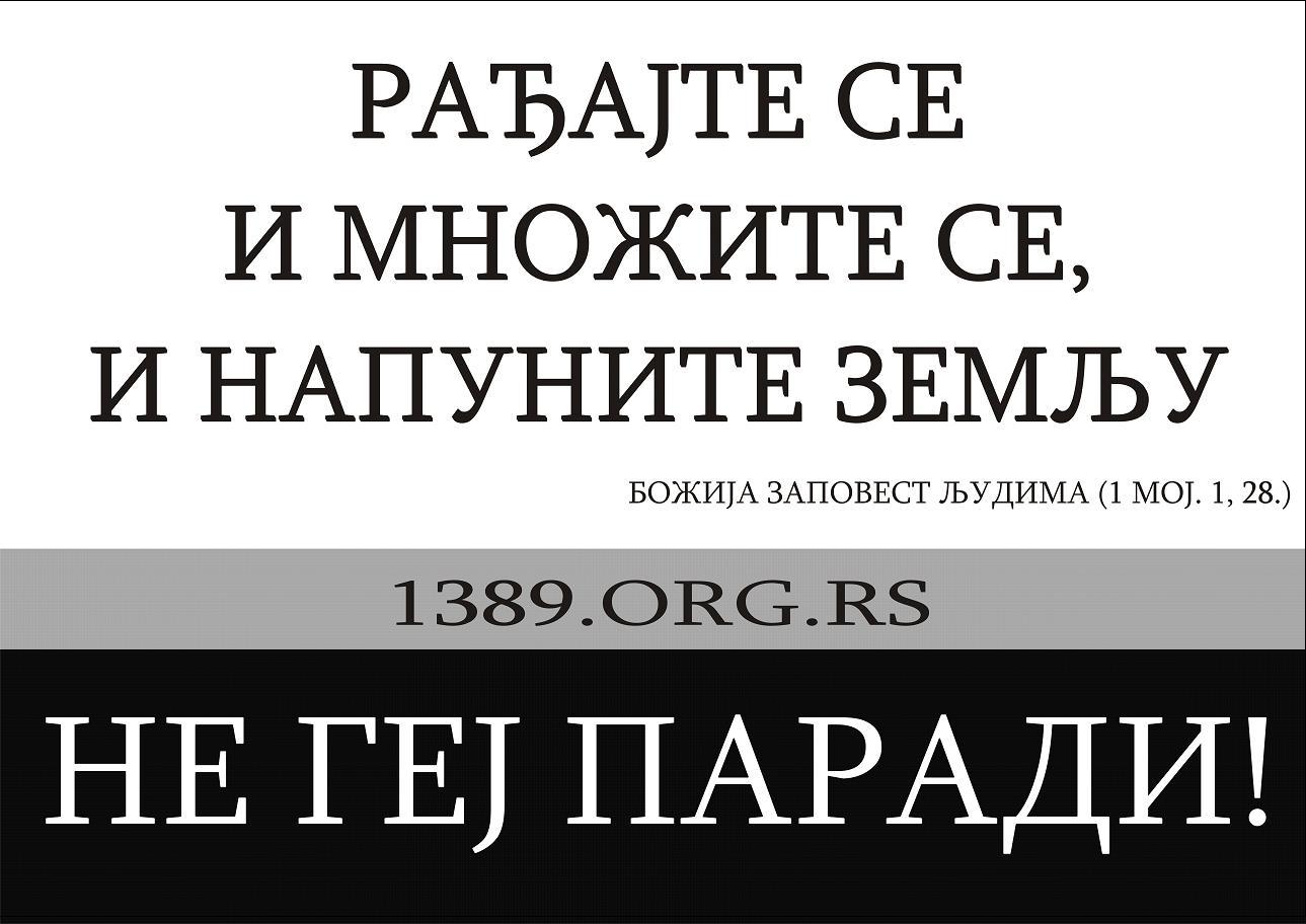 (увеличан приказ - погледајте) Почетком августа 2010. године, под заиста несрећним и понижавајућим околностима за српски народ и државу, покреће се кампања за очување најосновнијих хришћанских, цивилизацијских, моралних, биолошких и егзистенцијалних вредности и норми друштва у Србији, а против одржавања примитивне, антицивилизацијске и несрећне геј параде у Србији. Господ Бог је путем Светог писма, на самом почетку, заповедио људима: "Рађајте се множите се, и напуните земљу". Гле, ова древна заповест је тако актуелна данас у Србији у време негативног природног прираштаја, око 200 000 абортуса годишње, прогона Срба из многих крајева, опустошених села, итд. Заиста, одбацивши Бога и Његове заповести - одбацили смо живот! Бог и Православна Црква дају благослов једино мушко-женском браку, никако истополном. Идеја геј параде се директно супротставља Божијем закону и Цркви. Уместо Православних вредности љубави, рађања и новог живота, геј парада нуди туђинске католичко-протестантске "вредности": уместо благослова - проклетство; уместо рађања - изумирање; уместо лепоте - одвратност; уместо породице - оргије; уместо радости - понижење; уместо спокоја - сукобе. Одржавање геј параде би значило: суноврат традиције, непоштовање воље грађана, попуштање пред спољашњом репресијом (ЕУ), скрнављење престонице, историјску незапамћену срамоту, итд, итд. Позивамо све организације и појединце да подрже ову кампању и да на миран, цивилизован начин спречимо несрећу неслућених размера и са несагледивим последицама. Победићемо ако будемо сложни и непоколебљиви. НЕ ГЕЈ ПАРАДИ!