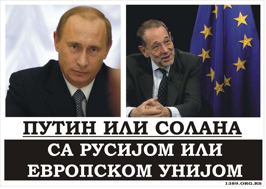Референдум: Русија или ЕУЈесен 2010. године је донела велику кризу Европске уније и идеје Европске уније код њених суседа. Економски проблеми већ дуже времена потресају ЕУ доносећи повећање незапослености, мобинг, правну несигурност, снижавање стандарда, штрајкове који блокирају читаве државе, итд. Ипак, ово није главни анти-ЕУ чиниоц ове јесени и ове године, већ су то – средњошколци. Они су, не обазирући се првенствено на запосленост, пензије, социјалне програме, итд, мотивисани пре свега младалачким моралом и осећајем за правду, бројним протестима уздрмали ЕУ, толико да судија у рингу већ почиње да одбројава, иако је ЕУ још формално на ногама и није у нок-дауну. Велика Британија паразитира на ЕУ, Белгија је пред распадом по неколико сценарија, Немачка покушава да појача свој утицај и почиње присилне интеграције мањина, најзадуженије земље већ су од чланица ЕУ добиле назив „свиње“ (PIGS), Француска протерује Роме али не може 3 милона својих младих који су на улицама, Лисабонски споразум је значајно централизовао бирократију Брисела стварајући од ЕУ идеолошку државу, у Аустрији се већ дуже времена скупљају потписи за излазак ове земље из ЕУ, Србији се намећу све тежи услови за придружење ЕУ, а међу њима је најболнији: независност Косова и Метохије, подршка европским интеграцијама је све мања, ... Са друге стране, Руска Федерација се показала као озбиљан и дугорочан партнер, који подржава Србију у свим најважнијим политичким питањима (очување суверености, територијалног интегритета, итд). Са Русијом имамо вишевековне беспрекорне братске односе, исту веру и порекло, сличан менталитет, словенски ет(н)ос, византијско цивилизацијско утемељење, итд. Руска улагања у Србију стално расту, а била би и много већа да на власти није екстремно про-западна коалиција. Русија има одличне економске, дипломатске и безбедносне односе са скоро целим светом, за разлику од ЕУ која је постала прилично омражена у свету, због учешћа са Америком у НАТО пакту и злочиначким војним агресијама на Југославију, Ирак, Авганистан, итд. Русија припада привредама које су у великом успону у последњој деценији, за разлику од ЕУ која је у озбиљној кризи и паду на светској лествици. Подршка развоју српско-руских односа међу грађанима Србије је из године у годину све већа, као и интересовање за руску културу. Све ове чињенице и још многобројне друге ненабројане, нам јасно говоре да је званична владина политика европских интеграција анахрона, нелегитимна, идеолошка и штетна по друштво. Стога тражимо да се велика дилема: „Русија или ЕУ?“ реши најдемократскијим, најлегитимнијим методама (отворене, слободне, равноправне) јавне расправе, а потом и референдумом на коме би грађани сами изабрали спољну политику и рекли какву будућност својој деци желе: са Русијом или ЕУ? До тада, сматрамо да се над грђанима Србије спроводи репресија и насилна европеизација. 22.10.2010.