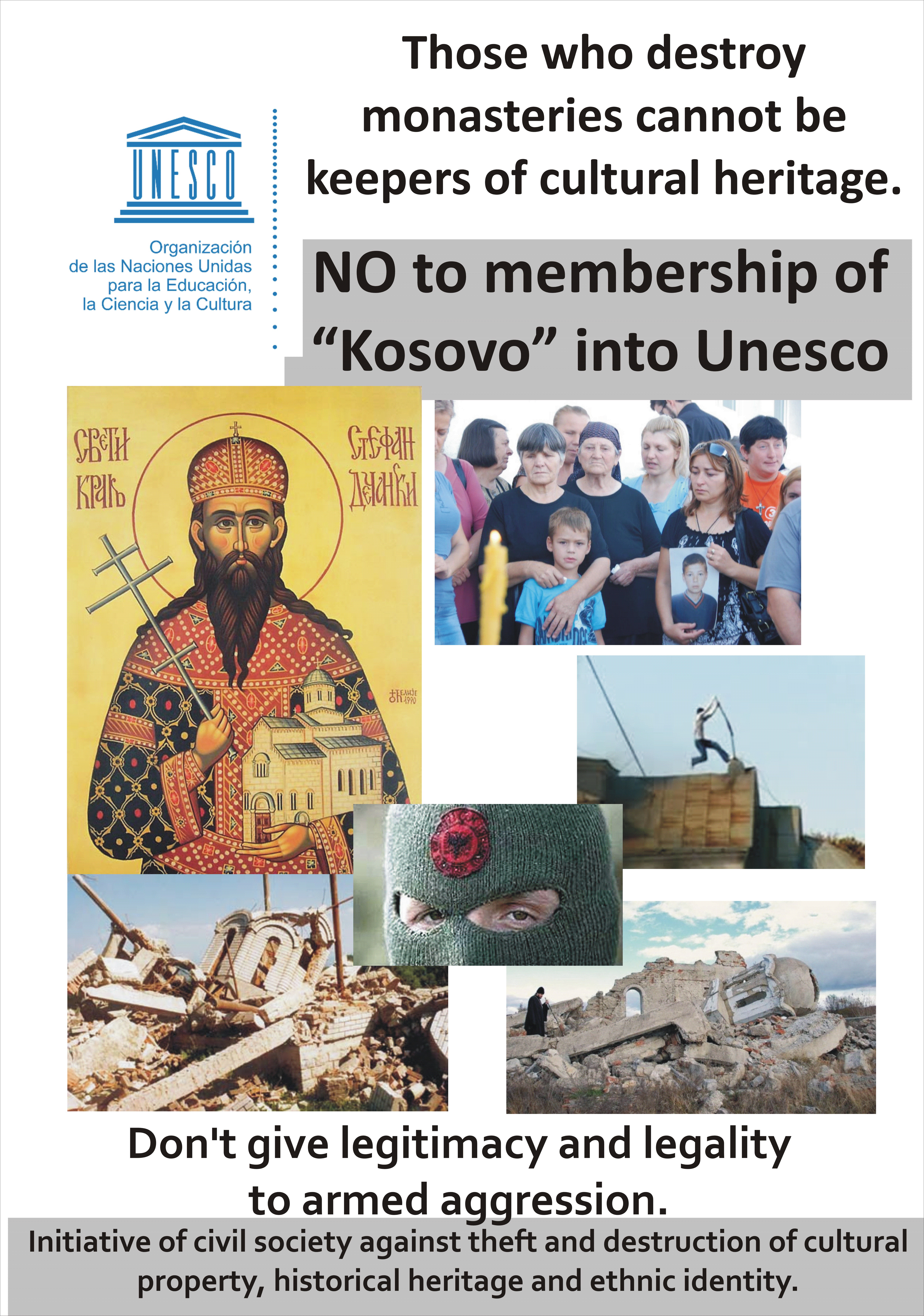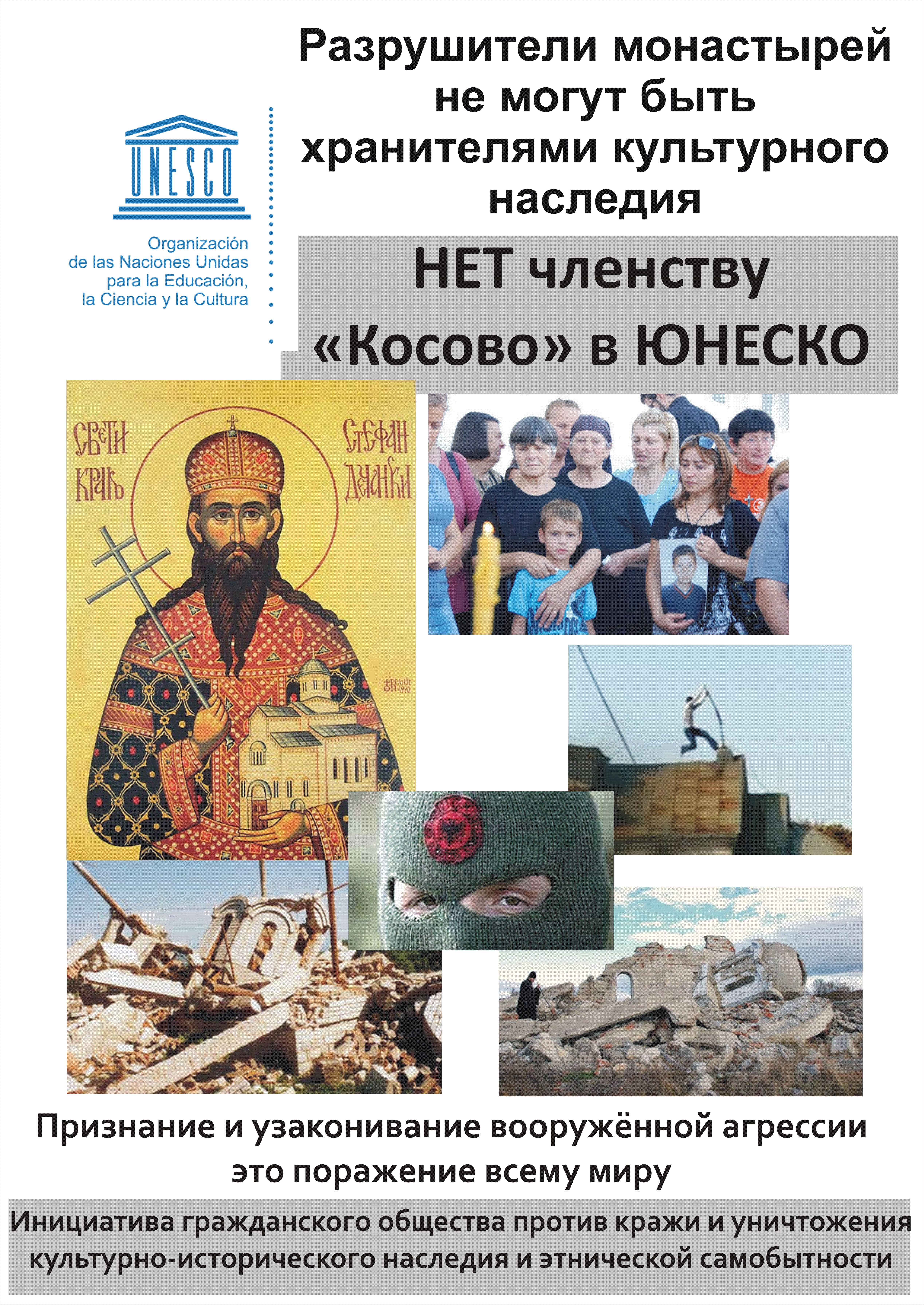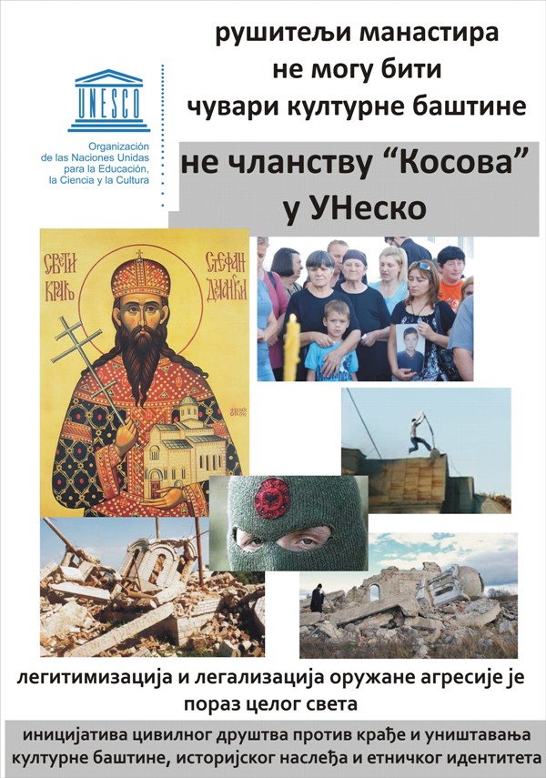 Рушитељи манастира не могу бити чувари културне баштинеНе чланству "Косова" у УНеско 13.10.2015. Those who destroy monasteries cannot be keepers of cultural heritage. Света земља - погледајте Енклаве - погледајте Злочини над Србима - погледајте плакат на српском језику у већој резолуцији (10 МБ) - преузмите плакат на руском језику у већој резолуцији (10 МБ) - преузмите плакат на енглеском језику у већој резолуцији (10 МБ) - преузмите