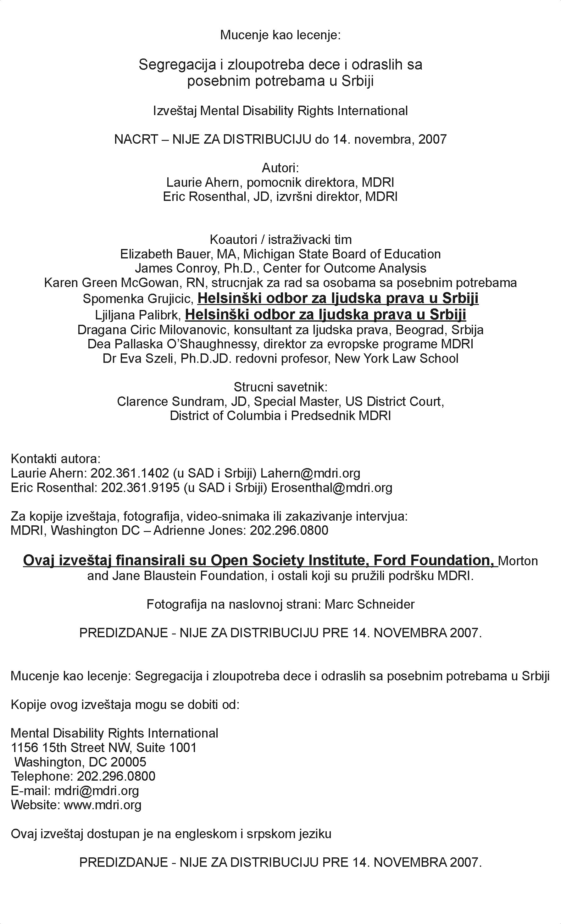 Лажи организације MDRI о логорима смрти за децу у Србији су објавили највећи западни медији. MDRI није ступио у контакт с партнерским организацијама у земљи које се баве том проблематиком. Текст је пласиран у циљу дестабилизације Србије у светлу актуелних политичких дешавања, поготово ако се има у виду да се у тексту "Хералд трибјуна" са овим извештајем повезују Косово и Метохија и Хашки трибунал. Ради се о једној организованој кампањи; пре свега, чињеница да је тај иззвештај објављен прошле недеље у свим међународним мање-више значајним медијима, а тек онда у медијима Србије, па тек онда предат министарствима, односно Влади; у извештају пише и да су запослени децу ометену у развоју систематски злоставњали. Наравно иза свега стоји Џорџ Сорош и његов нацистички Фонд за отворено друштво! Ту је и Форд корпорација, један од главних финансијера Адолфа Хитлера и његове Нацистичке партије тридесетих година ХХ века (због чега је у то време био покренут масовни бојкот Фордових аутомобила у Америци) и наравно Хелсиншки одбор наташе Кандић. Антисрпска екипа којој би позавиделе и усташе. Ево званичног документа који је објавила сама MDRI на свом сајту и који разобличава гнусну превару: