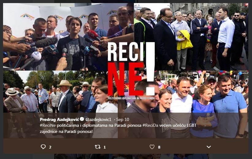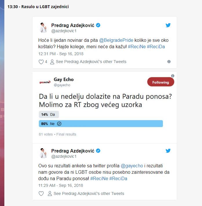 Спорни детаљи геј параде 2018 16.9.2018. Спорни су укупни организациони и безбедносни трошкови геј параде који се крију, слаб одзив изворне геј популације, број учесника на улици, итд. O томе говори геј портал "Gay Echo". https://twitter.com/azdejkovic1 Sve dok se junski i septembarski Prajd ne ujedine u jedan, imacemo situaciju da imamo sacicu ljudi. LGBT zajednica to zahteva i ne znam dokle ce to @goranmiletic da ignorise! Kaze novinarka N1 da se u jednom trenutku cinilo da Prajda nece ni biti, a policija je izjavila da ocekuju 200 ucesnika. #ReciDa #ReciNe @belgrade_pride @goranmiletic Hoce li ijedan novinar da pita @BelgradePride koliko je sve oko kostalo? Hajde kolege, meni nece da kazu! #ReciNe #ReciDa Ovo su rezultati ankete sa twitter profila @gayecho i rezultati nam govore da ni LGBT osobe nisu posebno zainteresovane da dodu na Paradu ponosa! #ReciNe #ReciDa Ovo su rezultati ankete na B92 sa pitanjem DA LI PODRZAVATE PARADU PONOSA. 74% anketiranih kaze NE! Odnos gradana Srbije prema Paradi ponosa se ne menja, on je konstantno negativan i nemojte posle da mi pricate o nekim rezultatima Parade ponosa! #ReciNe #ReciDa Ja cu danasnji praznik slobode i tolerancije sa 5 hiljada policajaca proslaviti u krugu prijatelja na nedeljnom rucku na sigurnoj udaljenosti... Srecan vam Prajd. Nazalost sutra necemo setati. Jednostavno vise ne mozemo da podrzavamo dogadaj koji osam godina ponavlja iste zahteve a ne donosi rezultate, koji nece da se transformise kako bi radio u interesu LGBT populacije i koji samo produbljuje sukobe unutar LGBT aktivisticke zajednice! Dragi Beogradani, u ime LGBT populacije vam se izvinjavam zbog maltretiranja: Od 10.30 do 15.30 bice zatvorene ulice Kralja Milana, Terazije, Kolarceva, Trg republike, a do 20.30 Vase Carapica, Studentski trg, Uzun-Mirkova! #ReciNe #ReciDa Imam gej druga i on je protiv gej parade - Ovi Beogradani su gej, ali nikad nisu isli na Prajd i nece ni sad: "Odvratne su nam te dugine boje i kordoni policije, to je totalni apsurd" http://www.telegraf.rs/vesti/srbija/2991218-ovi-beogradjani-su-gej-ali-nikad-nisu-isli-na-prajd-i-nece-ni-sad-odvratne-su-nam-te-dugine-boje-i-kordoni-policije-to-je-totalni-apsurd … via @telegrafrs Aktivisti @BelgradePride koji se kriju iza principa "nenasilna komunikacija" i vrednosti "solidarnost" sire lazi o drugim LGBT aktivistima da su seksualni predatori! To su vrednosti koje podrzavaju @NLinBelgrade @Sweden_Belgrade @CanadaSerbia @ukinserbia @USEmbassySerbia #ReciNe Da li mozete da zamislite taj bezobrazluk kada Aleksandar Savic @AleksandarBS iz @BelgradePride ide okolo i o svojim kolegama iz Parade ponosa Srbije govori da su seksualni predatori i da su seksualno zlostavljali ljude! Ocisti prvo svoje dvoriste i prozivaj @goranmiletic Goran Miletic @goranmiletic danas na konferenciji za novinare nije rekao koliko ljudi ocekuje na ovogodisnjoj Paradi ponosa @BelgradePride Posle dve razocaravajuce ispale je naucio da to vise ne govori! Jovanka Todorovic iz @GaytenLGBT je danas na konferenciji za stampu najvise pricala sta radi @LabrisBeograd jer izgleda nema sta da prica o tome sta radi Gayten! #ReciNe Kaze Goran Miletic @goranmiletic za @OnlineDanas da u cetvrtak stize najveci broj gostiju iz inostranstva za @BelgradePride! Hvala Goranu sto placa LGBT aktivistima iz inostranstva da dodu, inace mnoge nase prijatelje ne bi imali prilike da vidimo! #ReciNe #ReciDa Ne bih da budem zloban, ali vam je malo praznjikavo na otvaranju ovog Queer salona! @BelgradePride @goranmiletic #ReciDa #ReciNe Геј лезбејски инфо центар саопштио је да од данас на друштвеним мрежама покреће кампању #ReciNe политичарима и дипломатама на Паради поноса како би се, како наводе, скренула пажња са политичара на припаднике ЛГБТ за време одржавања Параде поноса. https://www.dnevnik.rs/drustvo/glic-reci-ne-politicarima-i-dilomatama-na-paradi-10-09-2018 … GLIC: Ne zelimo politicare i diplomate na Paradi ponosa http://bit.ly/2N0ITQ0 via @N1infoBG Kada vlast iskljucuje i pokusava da ucutka one koji je kritikuje mi to okarakterisemo kao antidemokratski i diktatorski. Kada to isto radi @BelgradePride i nevladin sektor, niko rec da kaze! Najlicemernije je da oni koji iskljucuju su prvi koji kritikuju vlast da iskljucuje!