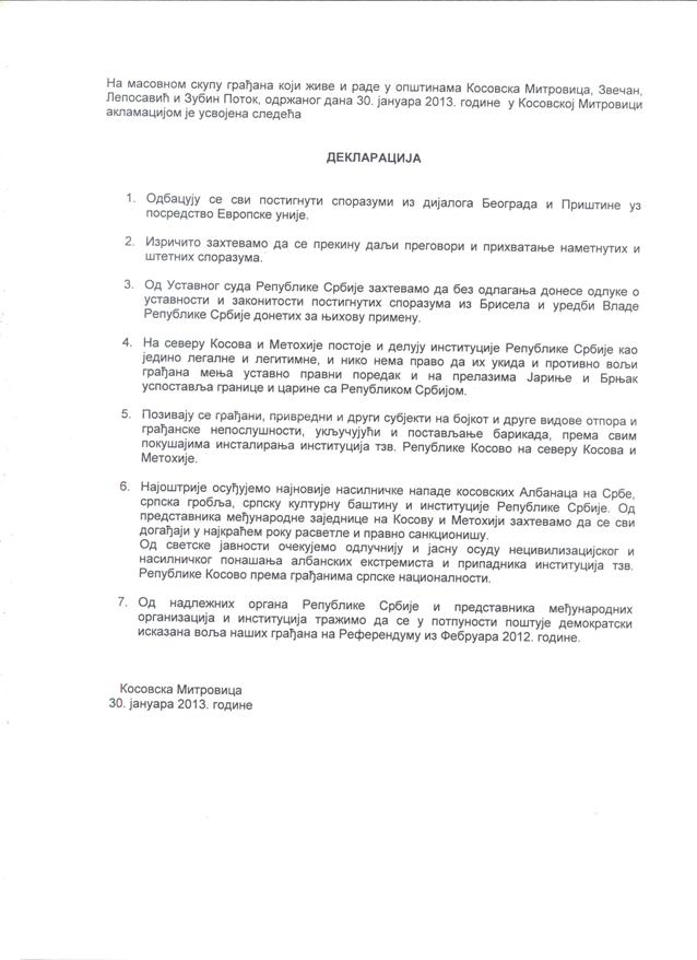Митинг под називом "Стоп бриселским обманана и преварама" одржан је у Косовској Митровици у среду 30.01.2013. Учествовало је неколико хиљада Срба. Покрет 1389 подржава захтеве изнете на овом народном сабору, на којем је задат још један тежак ударац европским интеграцијама Србије - ударац од којег ће се европејци тешко одбранити. Ево извештаја РТС-а са скупа: