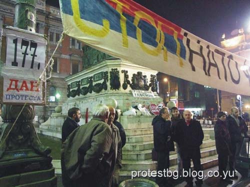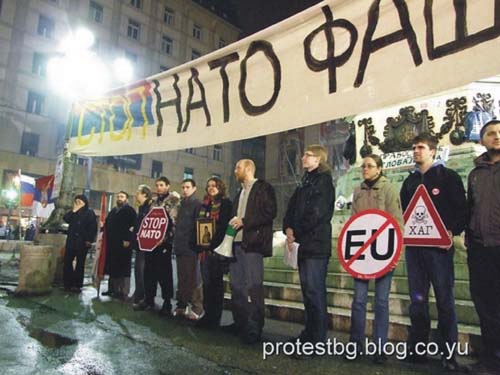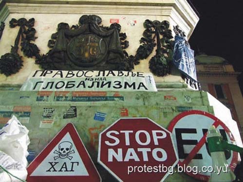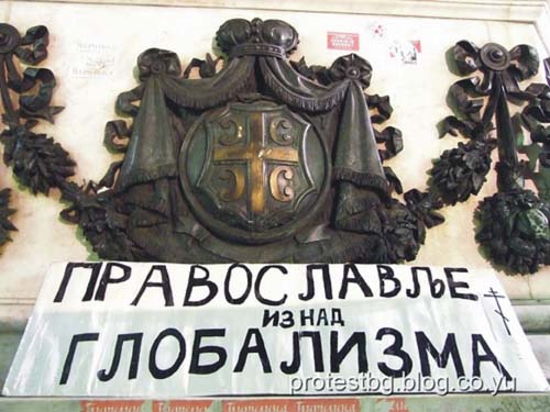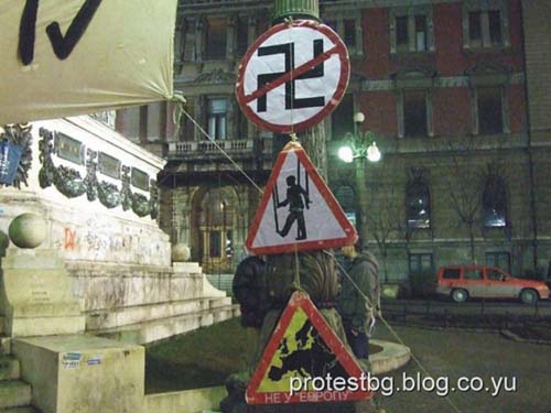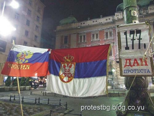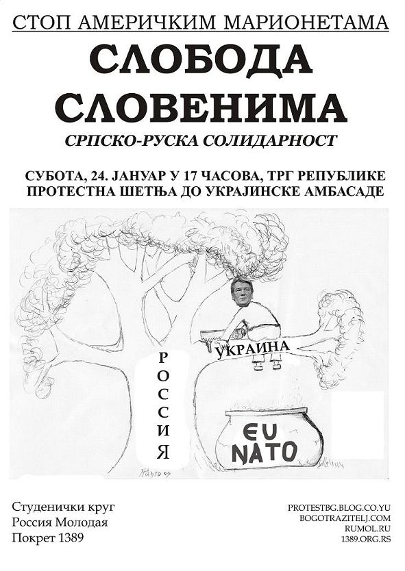 Протест испред Амбасаде УкрајинеСтоп америчким марионетама, слобода Словенима, У суботу 24. јануара у Београду изведена је протестна шетња против провокативне и неодговорне политике, коју води садашњи председник Украјине Виктор Јушченко, који је на власт дошао на незаконит начин уз финансијску, политичку и другу помоћ САД, ЕУ и НАТО пакта. Циљ ове акције је изражавање протеста народа Србије, јако погођеног неодговорним понашањем «наранџастог» шефа Украјинске државе, чије је деловање довело до прекида испорука руског гаса у земље Европе. Као што је добро познато, у Србији почетком јануара без грејања је остало више од милион људи у 17 градова наше земље. Треба напоменути да је главни циљ прекоокеанских диригената сукоба између Кијева и Москве – постепено увлачење словенске и православне Украјине у паклени казан еуроунијаћења и германизације. Сматрамо да није потребно да корпорације из западне Европе буду посредници у трговини гасом између Русије и Украјине и на тај начин беспотребно изазивају и провоцирају сукобе по римској крилатици «завади па владај». У Вашингтону и Бриселу добро знају да је баш у Кијеву настала прва Руска држава – Кијевскаја Русј, на чијем тлу Руси по први пут су били крштени по Православном обреду, што је од огромне важности за руску духовност и културу. Сматрамо логичним и важним братске односе Русије и Украјине, они се не смеју угрожавати зарад интереса оних који су и на Балкану оставили пустош; стари назив за Украјину је Малорусија, а велика већина њеног становништва је Православна. Такође, оштро се противимо намерама Виктора Јушченка да уведе Украјину, дом козака, у НАТО пакт и на тај начин угрози безбедност Русије. Протест су организовали Народни покрет 1389, Студенички круг и руска омладинска организација «Млада Русија». Осим тога, на учешће у протесту су позвани сви грађани и симпатизери/чланови низа патриотских организација. Ова акција је уједно и 177. дан свакодневних протеста на Тргу републике против евро-атлантских интеграција и хашког фашизма. Неколико стотина грађана се окупило на тргу; након обраћања представника удружења: Млада Русија (представник организације Илија Горјачев), Студенички круг и 1389 и читања вести Информационог центра, кренуло се у протестну шетњу до Булевара ослобођења. Надомак Амбасаде колони су се придружили и припадници Образа. За ову прилику је сачињен посебан транспарент који позива на словенску слогу, солидарност и мудрост у време евроатлантских обмана и размирица које се шире; транспарент такође указује на посредничку улогу Србије у побољшавању односа Русије и Украјине ради интереса обе стране. На плакатима који су излепљени сликовито је представљена неразумна политика украјинског председника Јушченка који сече грану на којој седи и кида руско етничко, народно стабло намећући украјинској држави прозападни курс. Захваљујемо се свим организацијама које су помогле одржавање скупа позивањем својих чланова и уступањем техничке опреме. Режим организаторе скупа засипа судским позивима и кривичним тужбама, али протести не посустају. http://srpska.ru/article.php?nid=10632&sq=&crypt=