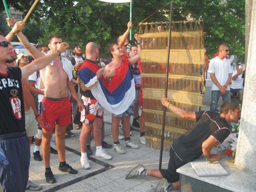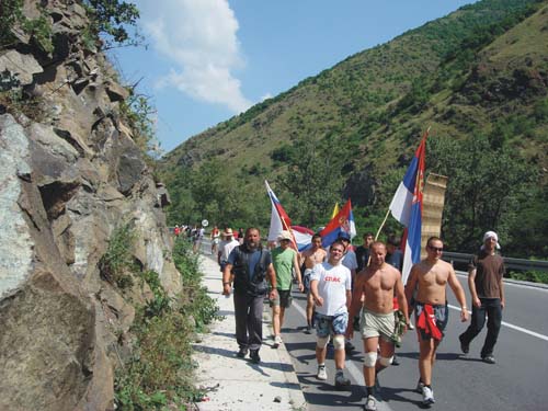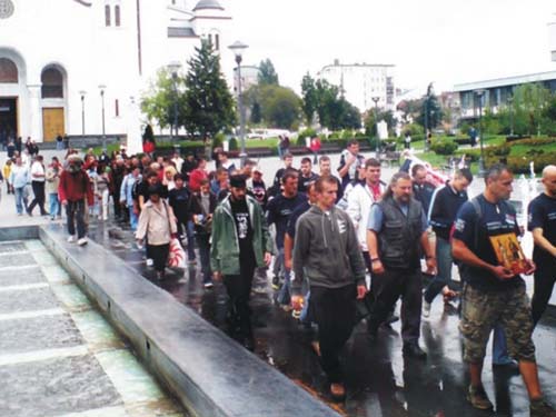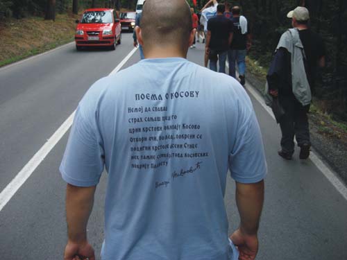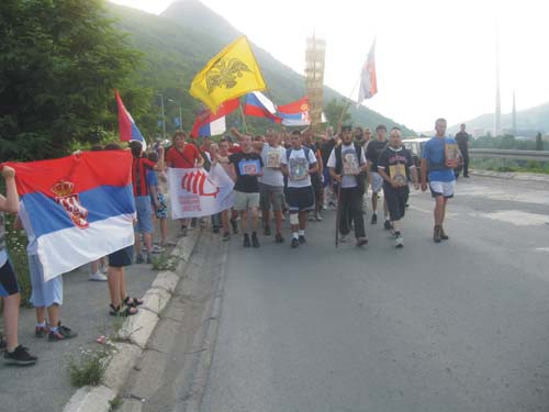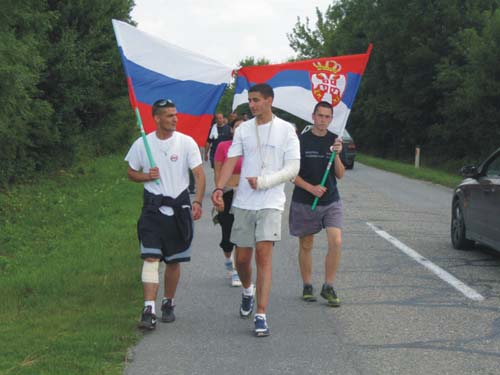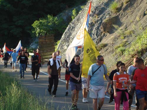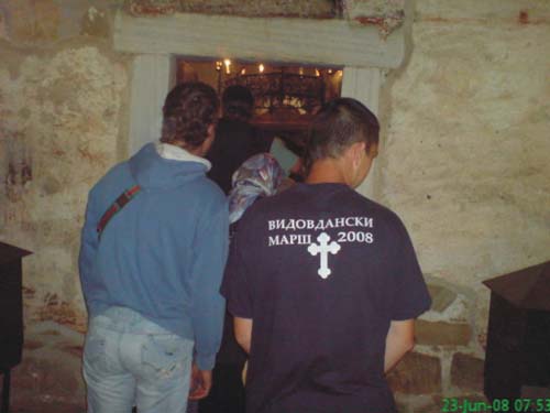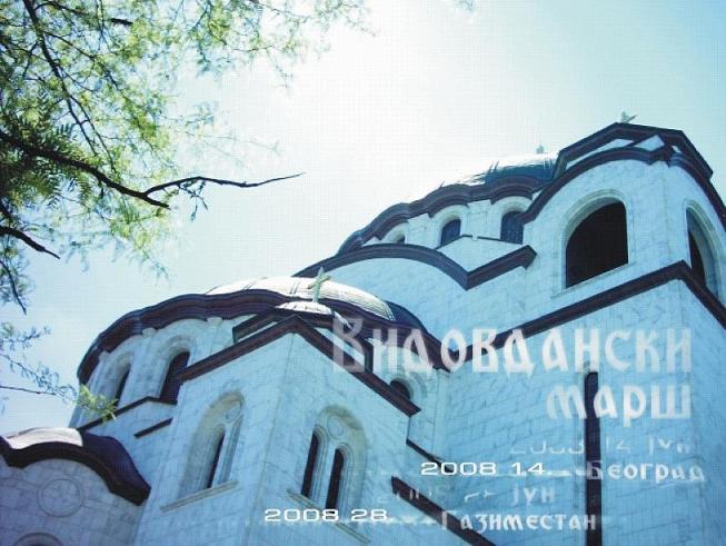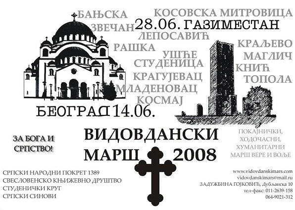 марш вере и воље Организациони одбор: vidovdanskimars@mail.ru * ЗА БОГА И СРПСТВО! Видовдански марш 2008 креће 14. јуна у 12 сати испред Храма Светог СавеВидовдански марш по препоруци и савету добијеном у Студеници уз Божију помоћ постаје заветни подухват, српска традиција, велико Видовданско народно ходочашће. Српски народни покрет 1389, ће се као иницијатор, покретач и зачетник Видовданског марша старати предано да се смисао и организација Видовданског марша очувају, да овај марш постане отворени свесрпски бљесак искреног Српства и Православља, наше борбе да сачувамо Косово и Метохију да се себи и другима представимо у правом светлу, у духу вере, воље и добронамерности. Да сачувамо српске светиње, да сачувамо свој идентитет, да покажемо поштовање према својој историји. Старешина великог Храма Светог Саве, протонамесник Лука Новаковић, одржаће пред полазак 14. јуна у 11.30 молитву за срећан пут учесницима Видовданског марша. Како је изгледало прошле године, можете погледати - ОВДЕ Наравно, маршираће се под Благословом Патријаршије Српске Православне Цркве, а документ о томе можете погледати ОВДЕ Рута остаје не промењена у односу на прошлу годину, увећану је моћете видети - ОВДЕ кратки видео записи из колоне марша - ОВДЕ и ОВДЕ утисци са марша 2008 у облику видео записа - ...погледајте ... још један спот - ...погледајте улазак на свети Космет - ...погледајте свако јутро одлазак у цркву и молитва за срећан пут - ...погледајте марширање по врућини... - ...погледајте ... и по киши - ...погледајте Видовдански марш на: ...руском ...још на руском и ...пољском Бојан, учесник марша из Канаде, извештај на енглеском - ...погледајте На Видовданском маршу ове године су учествовали и представници удружења НАШИ из Русије. Хвала вам браћо и добродошли нам поново! извештај чланова ДМД-а, учесника Видовданског марша - ...погледајте