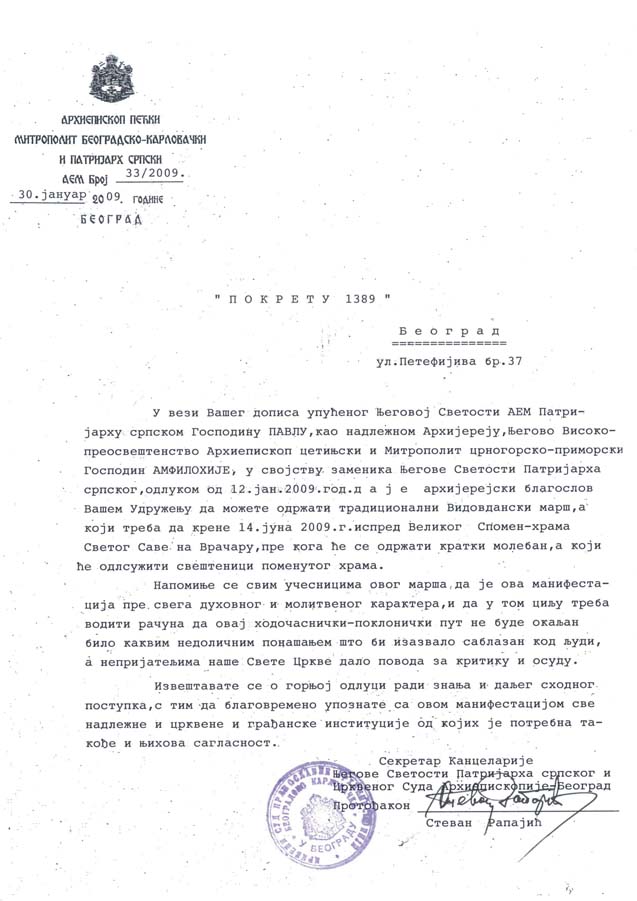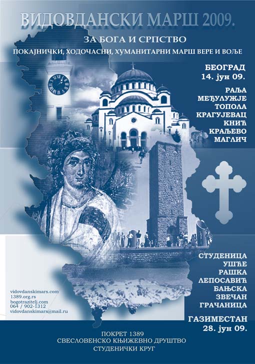 "Видовдански марш" 2009 од Београда 14.06. до Газиместана 28.06. је успешно завршенЗахваљујемо се Богу, Патријаршији која нам је дала Благослов, родитељима, црквеним парохијама, општинама, манастирима, удружењима, спортским центрима и бројним појединцима и свима који су помогли остварење Видовданског марша 2009. годинеНаравно, марширало се под Благословом Патријаршије Српске Православне Цркве, а документ о томе можете погледати ОВДЕ Видовданский марш (на руском) Руту кретања можете погледати - ОВДЕ Саопштење за јавност - погледајте План кретања по данима и градовима - погледајте Промотивни спот Видовданског марша - погледајте Најава Видовданског марша 2009 - погледајте Како се припремити за Видовдански марш? - погледајте Како је изгледало прошле године, можете погледати - ОВДЕ Како је изгледало 2007. године на првом маршу, можете погледати - ОВДЕ Један од учесника марша је и Арно из француског удружења "Solidarite Kosovo" - погледајте Један од домаћина Видовданског марша је и манастир Сочаница на Косову и Метохији - погледајте Други сет фотографија - погледајтеТрећи сет фотографија - погледајте